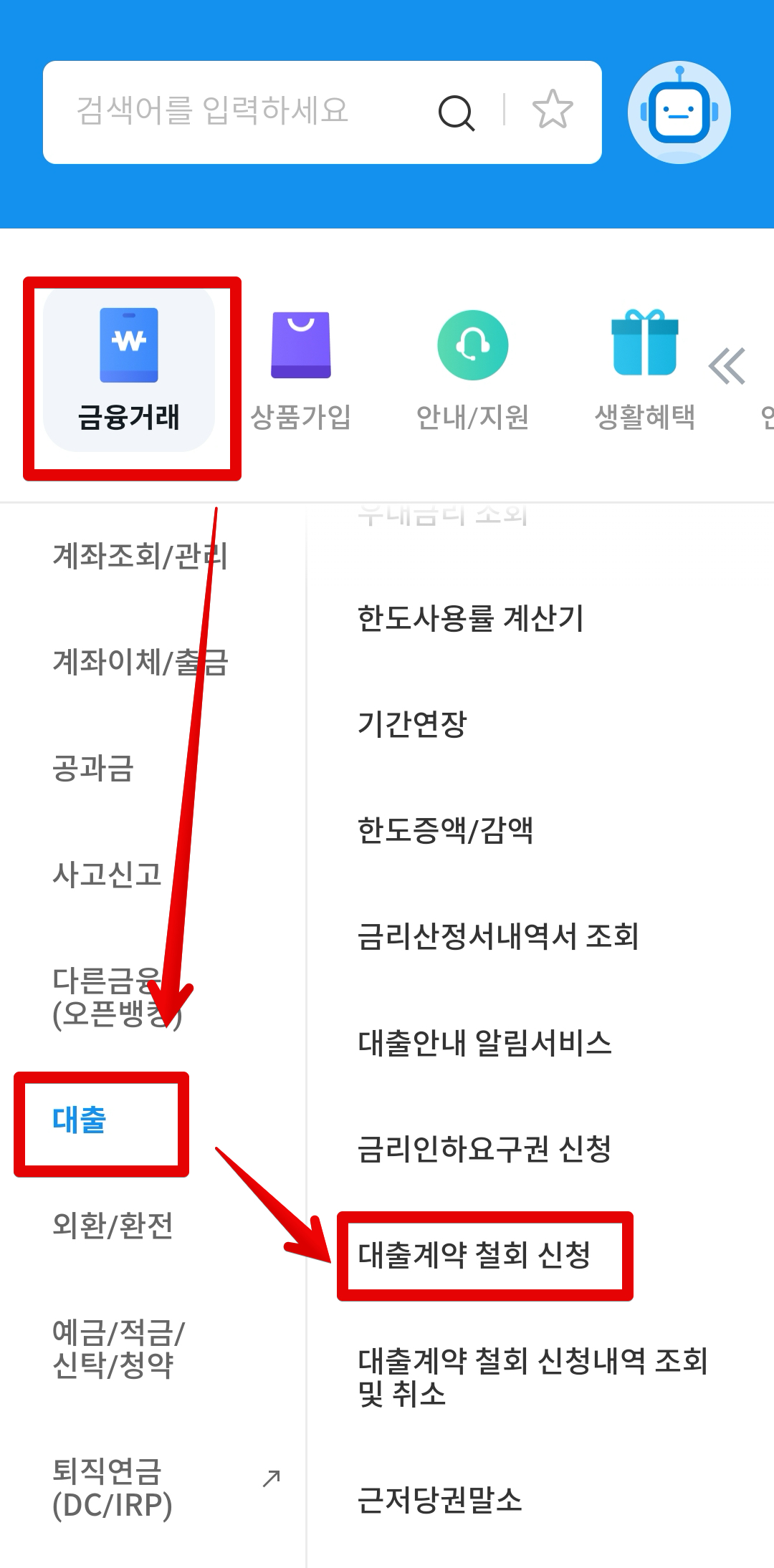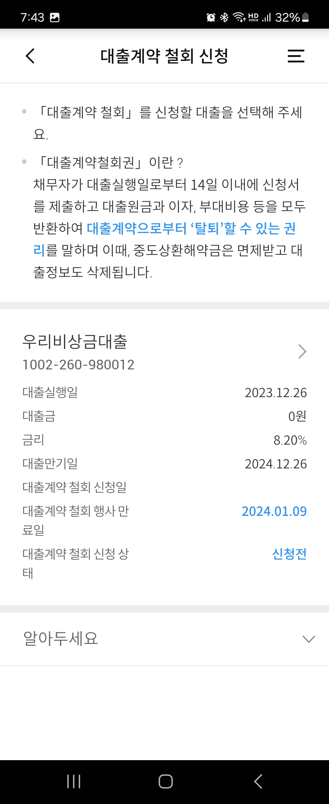 이제 한도제한이 풀렸으니 대출청약철회를 진행해야합니다.