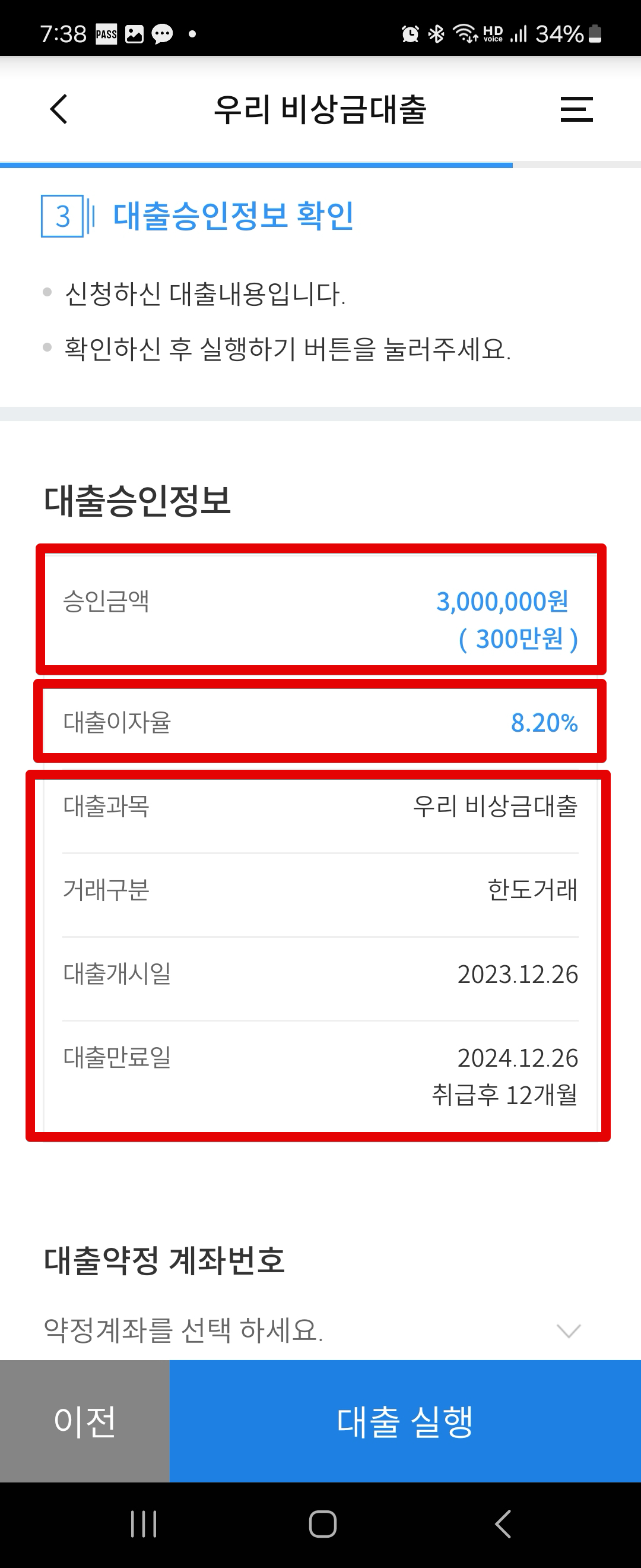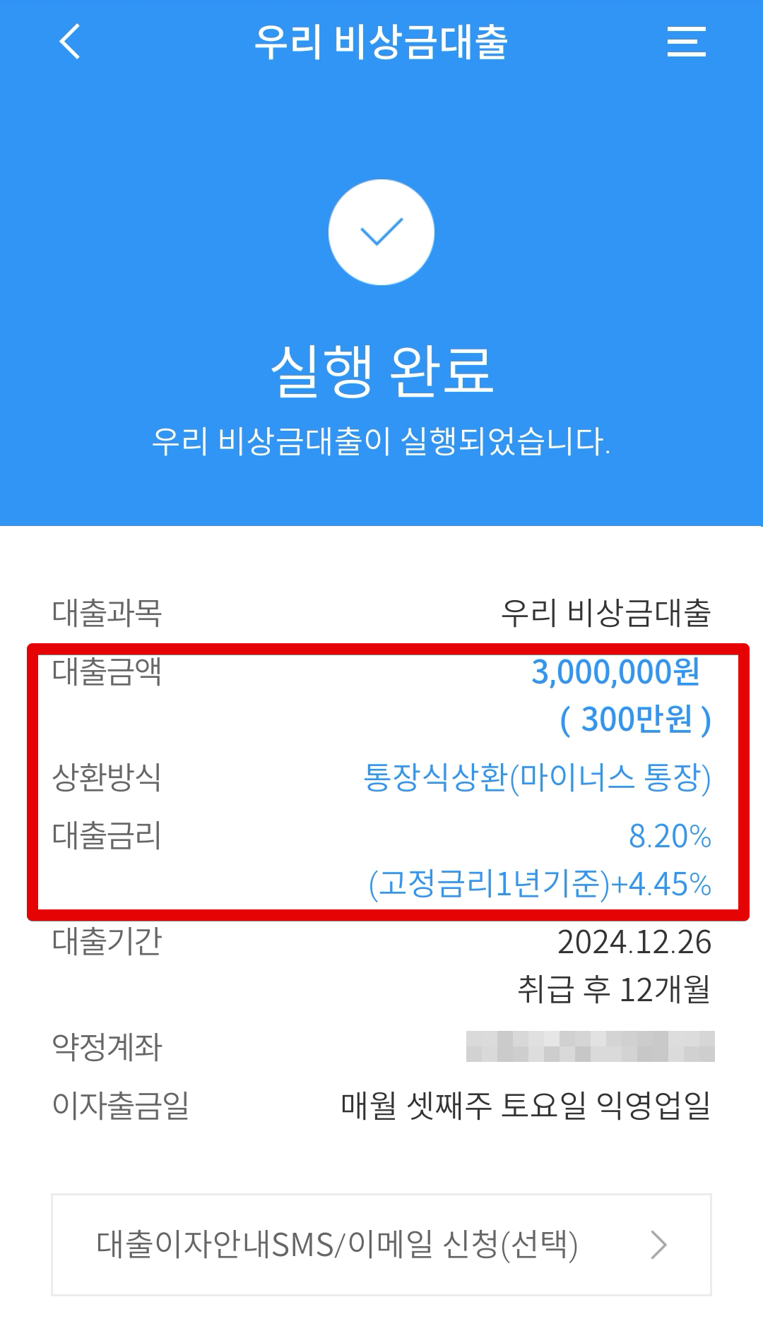 대출실행 이후에는 취소 및 변경이 불가능하니 꼭 천천히 따라와주시고요. 대출실행이 완료되면 실행완료라고 뜨면서 내역을 확인할 수 있습니다. 우리은행 비상금대출 대출금리가 고정금리로 1년치에 4.45% 가산금리가 붙습니다.