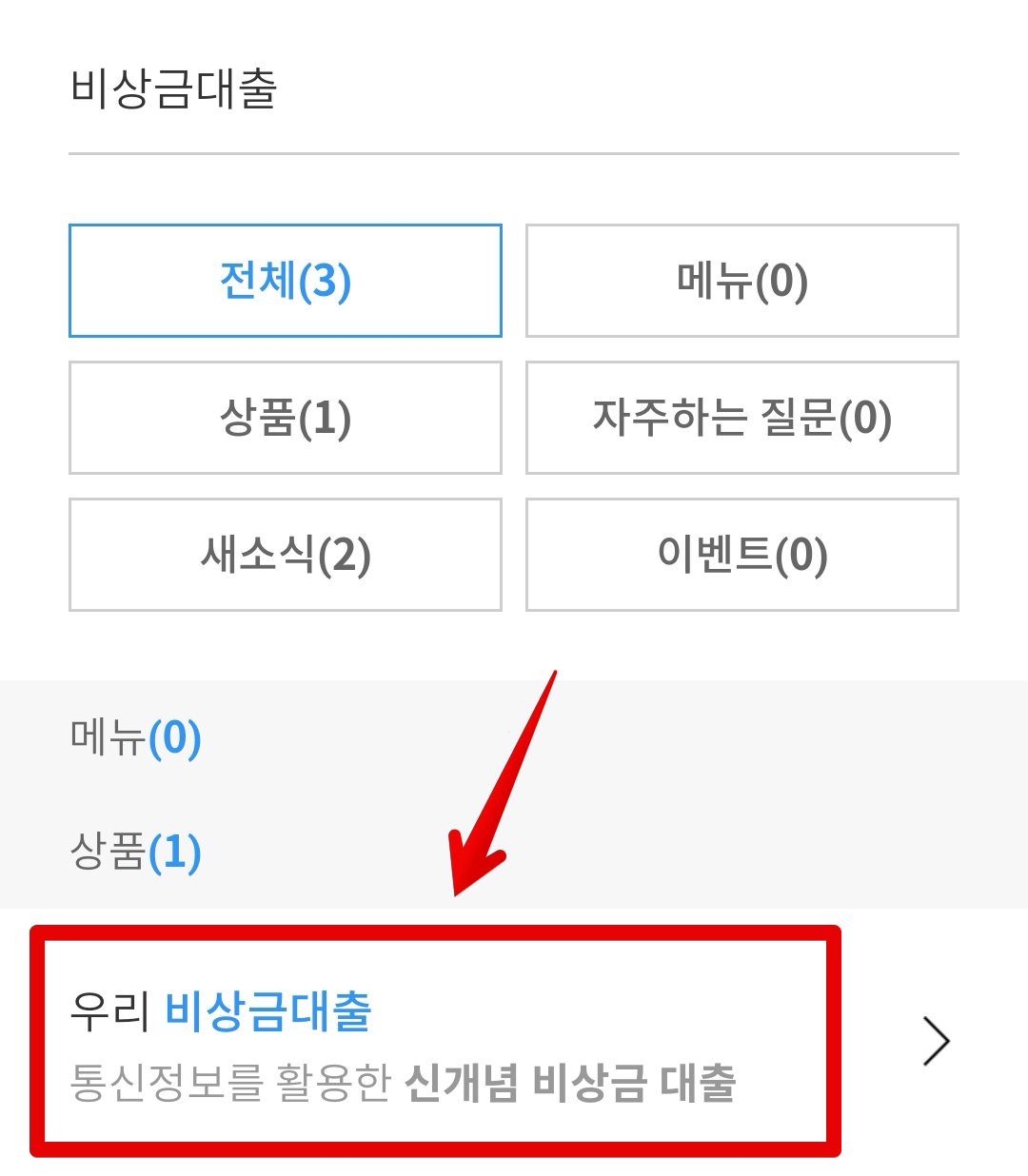 아래쪽에 상품쪽에 보면 [우리 비상금대출] 항목이 있는데 클릭해줍니다. 통신사 정보(SKT, KT 등)를 이용하는 비상금 대출 상품이기 때문에 통신 3사를 이용하는 고객만 쓸 수 있습니다.