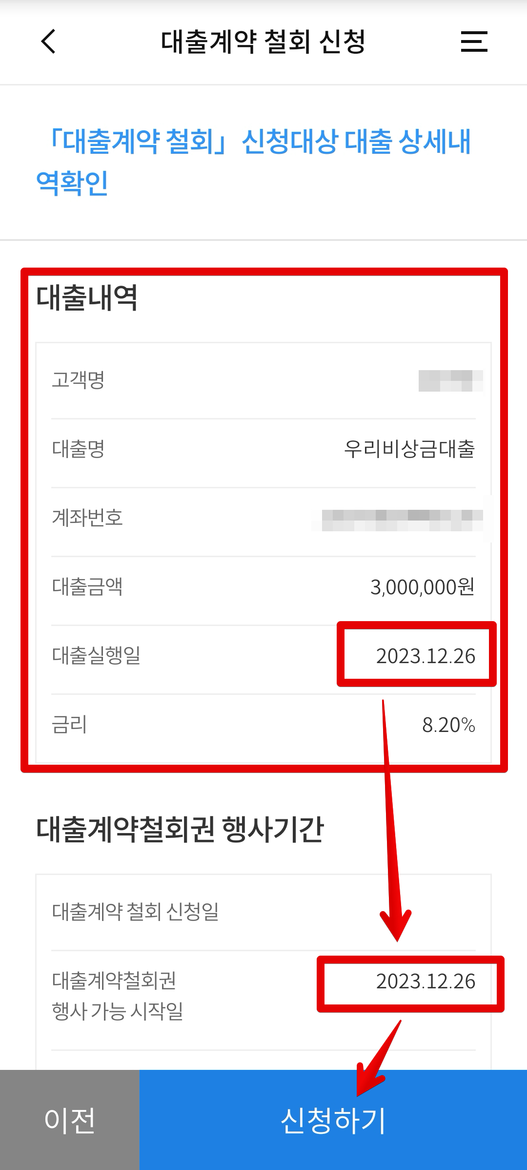 대출계약 철회 신청 메뉴에서 대출실행일과 대출계약철회권 행사 가능 시작일을 체크하세요. 대출실행일과 대출계약철회권이 모두 당일로서 같은날이 표시되어 있어야 철회가 가능합니다. 마지막으로 [신청하기]를 클릭하면 대출계약 철회 신청이 완료됩니다.