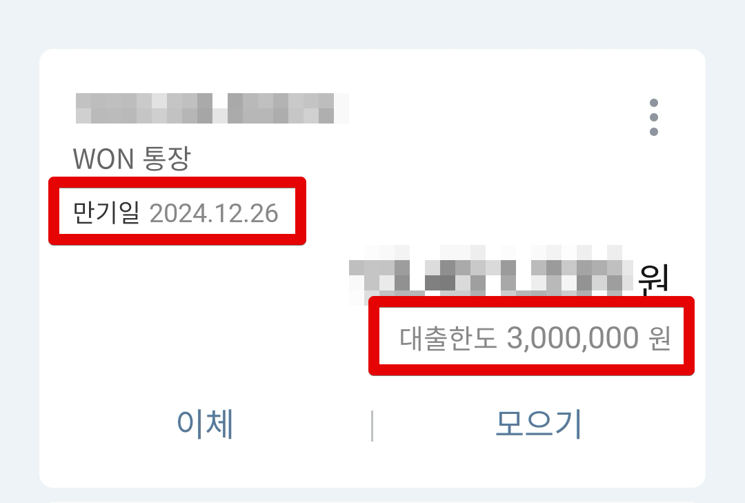 이제 다시 계좌 화면으로 넘어가보면, 한도제한이라는 글자도 없고, 기존에 있었던 만기일자와 대출금액 표시도 사라진 모습을 볼 수 있습니다.