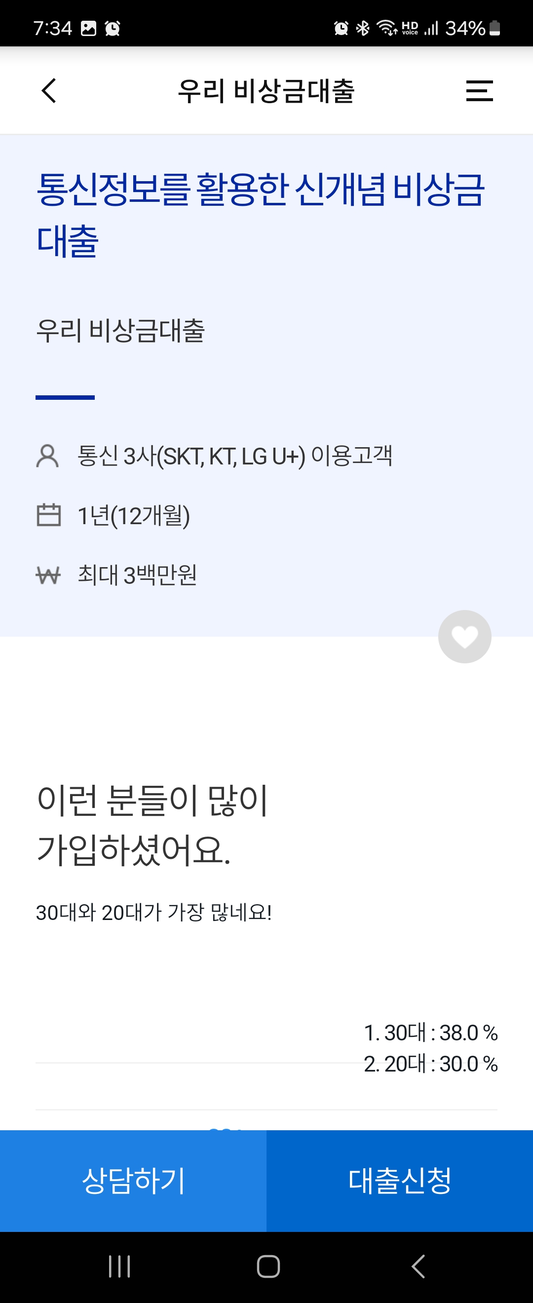 오른쪽 이미지에서 우리 비상금대출은 1년이며 최대 300만원까지 가능하다고 알려줍니다. 30대가 38%, 20대가 30%나 가입을 하셨다고하네요... 아무튼 아래쪽에 대출신청을 클릭해줍니다.