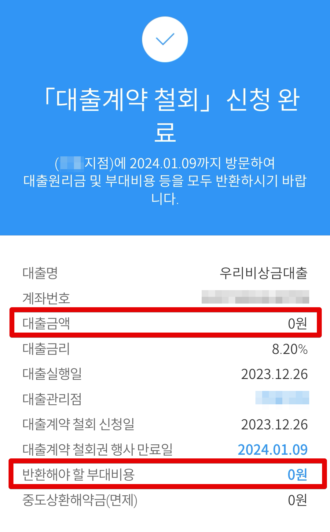 여기까지 오게되면 상단에 OO지점에 방문해서 대출원리금과 부대비용을 반환하라고 하고 있는데, 대출실행 후 비용을 사용하지 않았으므로 대출금액이 0원이며 반환해야할 부대비용도 0원으로 잡힌 모습을 볼 수 있습니다. 중대상환해약금은 면제입니다.