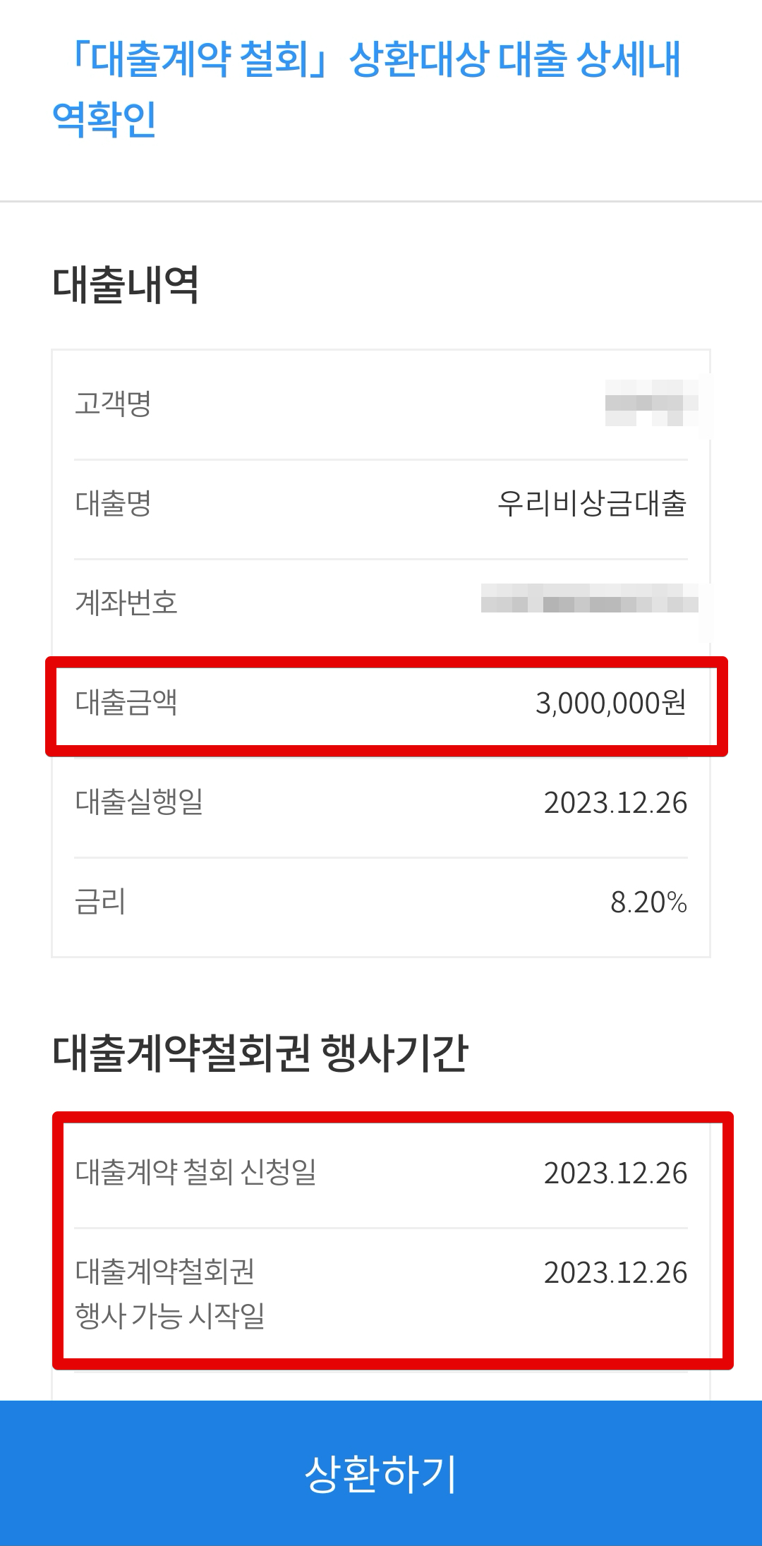 내용을 읽어보고 [상환하기]를 클릭합니다. 대출금을 사용하지 않았고 당일 신청 후 당일 청약철회를 진행하는 것이므로 비용은 없습니다.