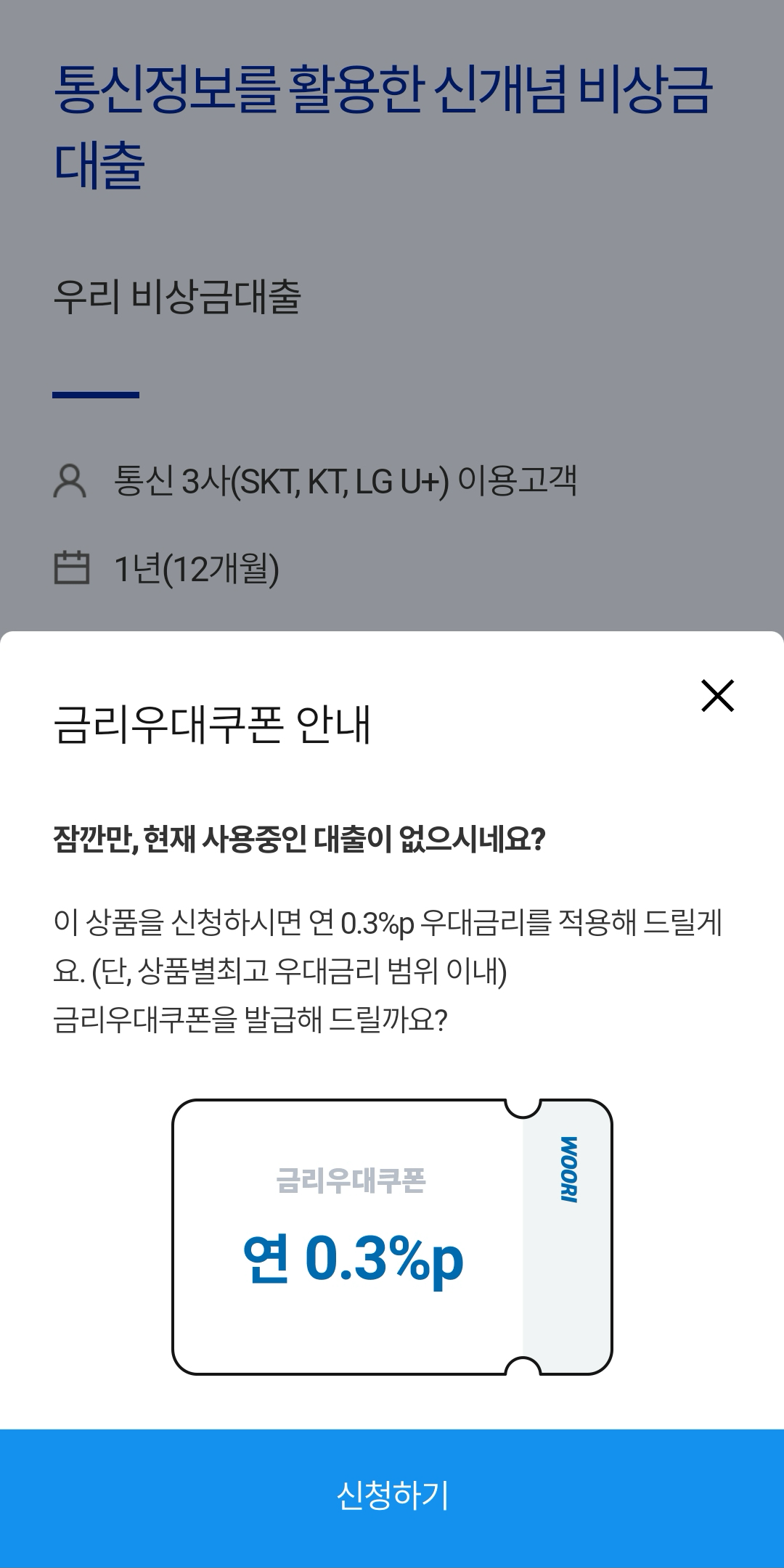 처음에 들어오면 금리우대쿠폰을 준다고 하는데 연 0.3% 우대쿠폰이 있습니다. 우리 비상금대출은 기준금리 + 가산금리가 약 4% 정도 붙어서 현재 기준으로 8%가 넘는 금리로 대출받는 상품입니다. 저희는 대출신청 후 바로 청약철회를 할 것이므로 금리우대 쿠폰이 필요가 없어서 받지 않았습니다.