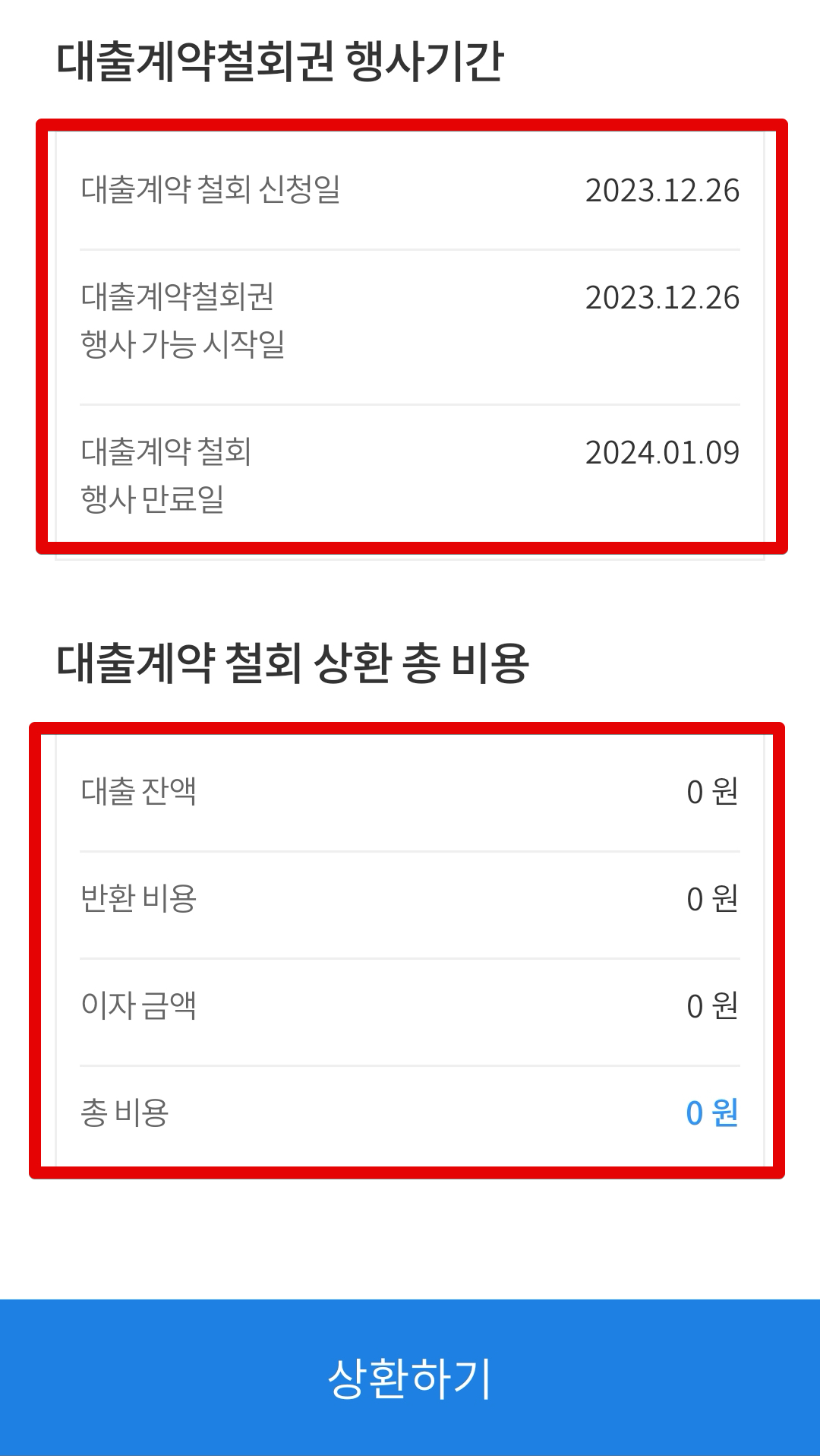 대출계약철회권 행사기간 확인 및 대출계약철회 상환 총 비용을 확인하세요. 꼭 0원이어야합니다. 끝으로 [상환하기]를 클릭해서 상환해주고, 대출계약 상환 완료 표시를 확인하세요.
