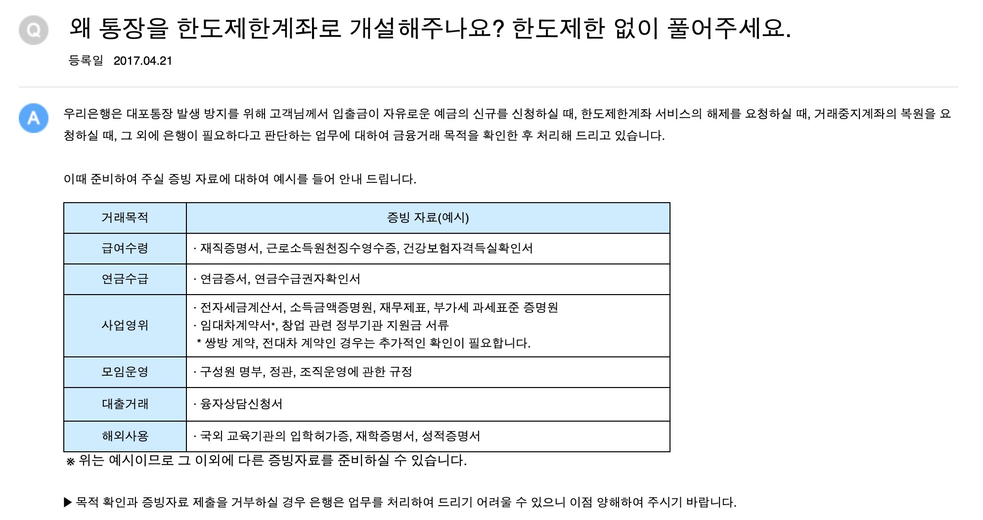 우리은행 홈페이지에 있는 Q&A를 살펴보면, 우리은행에서 기본적으로 한도제한계좌로 개설되고, 이걸 해제하기 위해서는 증빙자료를 준비해야하는데 증빙자료가 무지하게 많고 까다롭습니다. 지점도 방문해야하고요.