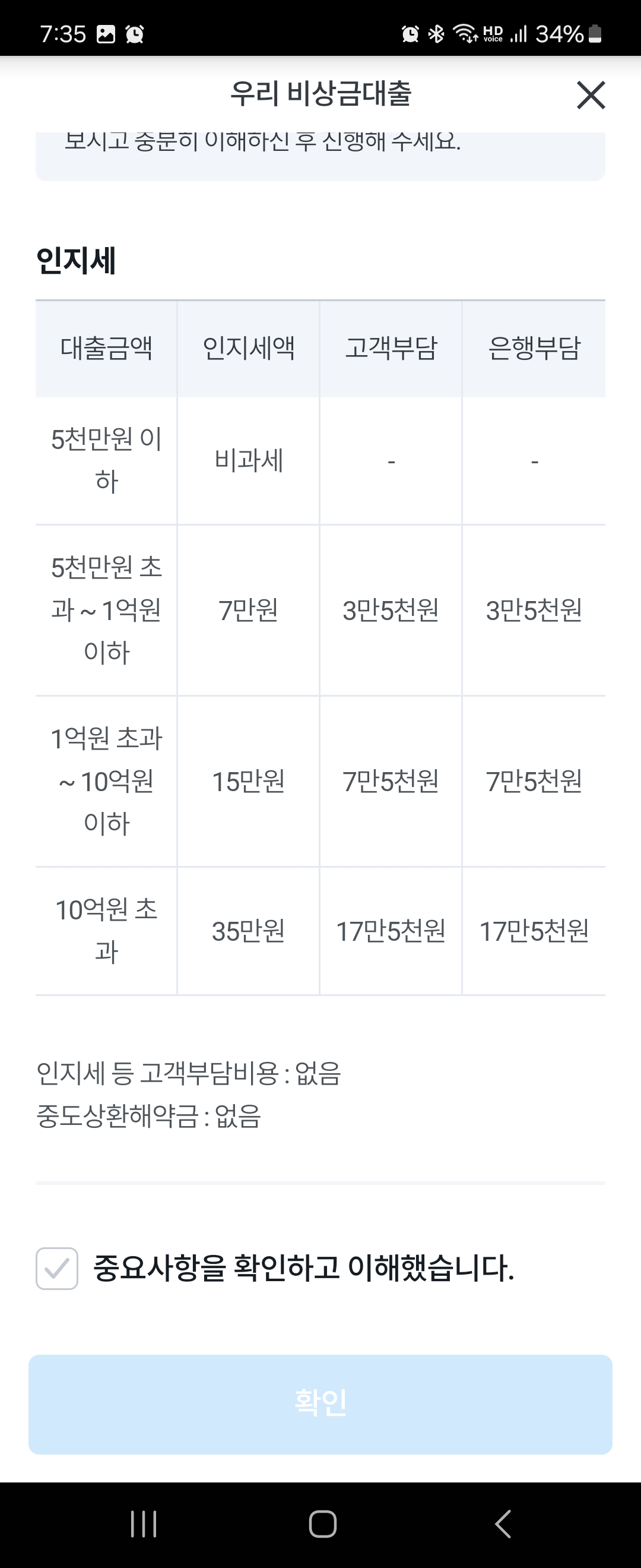 우리은행 비상금대출 상품의 경우 비대면 대출계약 상환이 가능하다고 표시됩니다. 여기에서 이 창을 끄지말고 꼭 [확인]을 눌러서 이어서 진행해주세요.