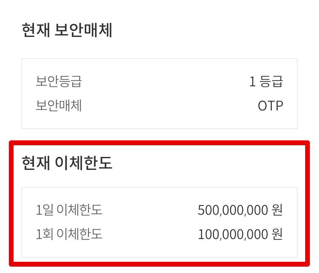 신분증 사진 찍는걸로해서 이제는 우리들에게도 익숙한 비대면 방식으로 본인인증 처리해주시고요. 이체한도를 최대치로 증액해주었습니다. 우리은행 이체한도 최대치는 제 계좌의 경우에는 1일 이체한도 5억원, 1회 이체한도 1억원입니다. 이체한도는 바로 변경이 가능해서 이렇게만 하시면 바로 변경이 되고 이제 편하게 이용할 수 있습니다.