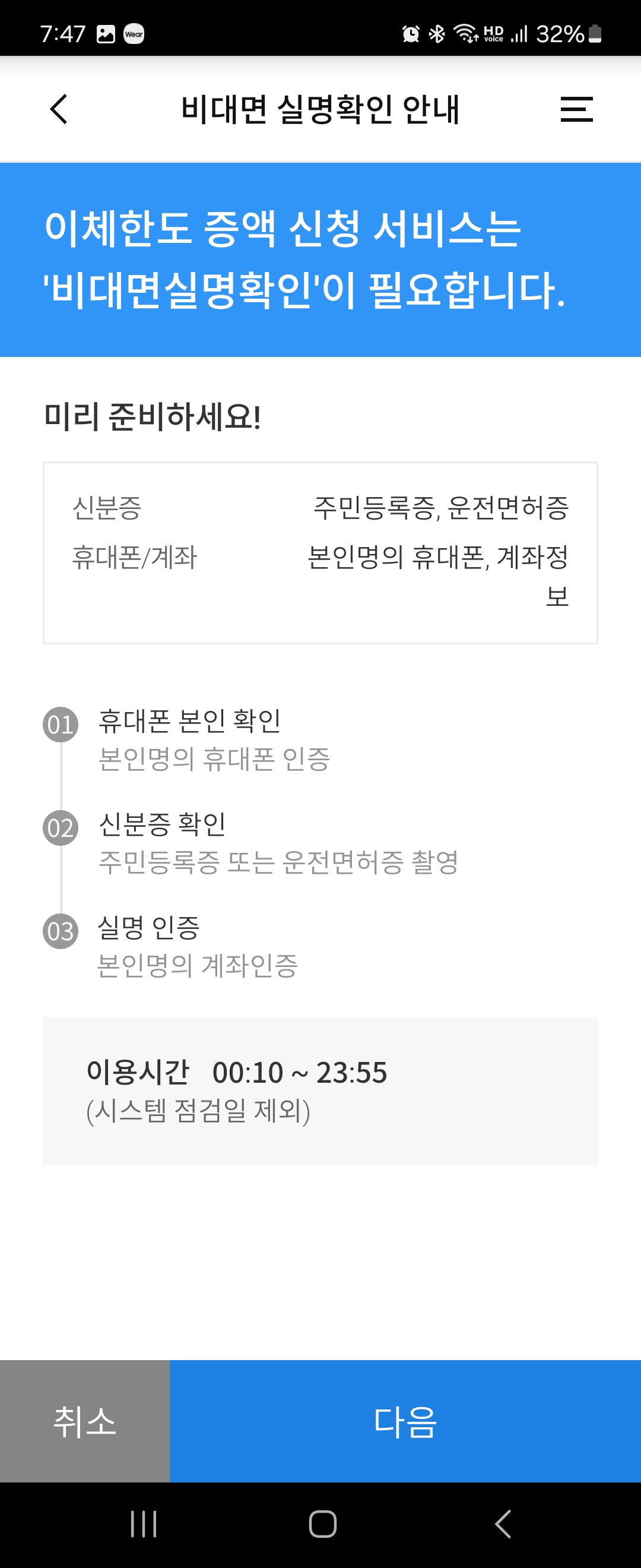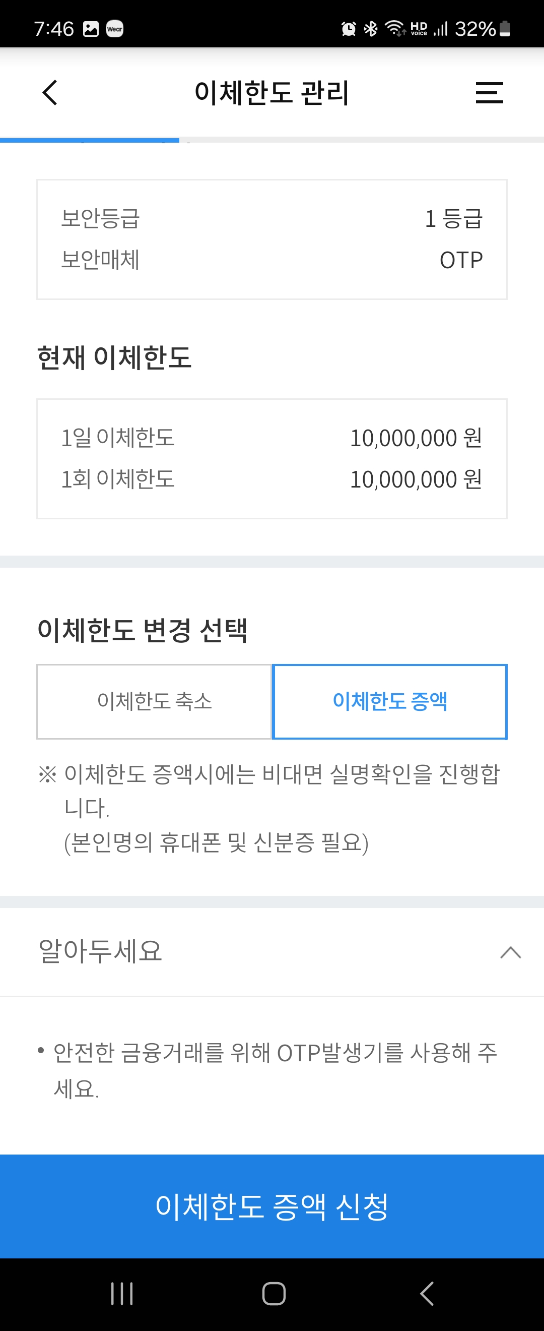 한도제한계좌를 풀고나서 메뉴에서 [이체한도관리]로 들어가게 되면, 이체한도를 볼 수 있는데요. 저는 보안등급 1등급의 OTP를 등록해두고 쓰고 있고 실제 본인 인증은 지문으로 처리하고 있습니다. 현재 이체한도를 보면 1일 이체한도 1천만원에 1회 이체한도 1천만원이 잡힌걸 볼 수 있습니다. 그래서 메뉴를 아래쪽으로 내리면 [이체한도 증액] 탭을 클릭하시고 신분증 준비해주세요.