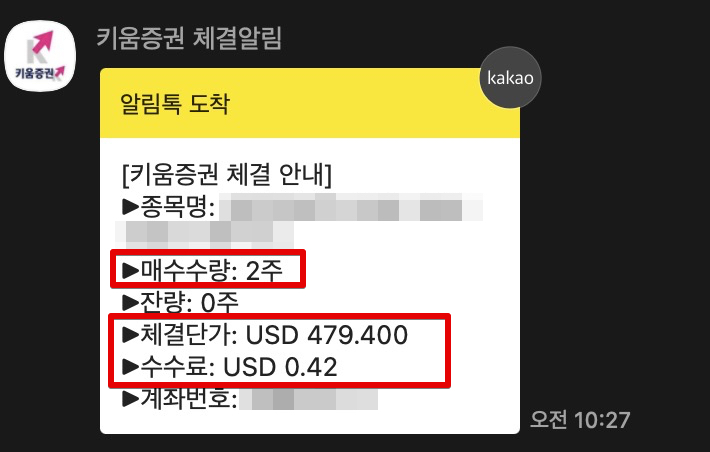 다음으로 협의수수료 이후 미국 ETF 매수해보았습니다. 479.4달러 짜리 미국 ETF를 2주를 매수했을 때의 수수료가 0.42달러가 들었으므로 1주당 계산으로는 0.21달러입니다.