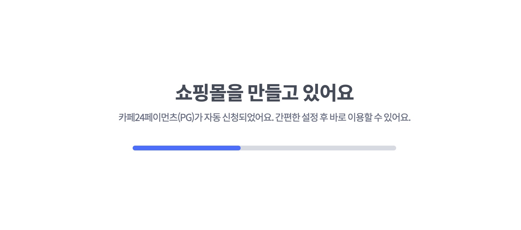 가입이 완료되면 "쇼핑몰을 만들고 있어요"라는 문구가 나오면서 아래쪽에 "카페24페이먼츠(PG)가 자동신청되었어요"라는 문구가 나오는데요. 여기에서 카페24페이먼츠가 뭐냐하면, 쇼핑몰에서 카드결제(PG) 서비스를 이용할 수 있도록 해주는 서비스 이름입니다.