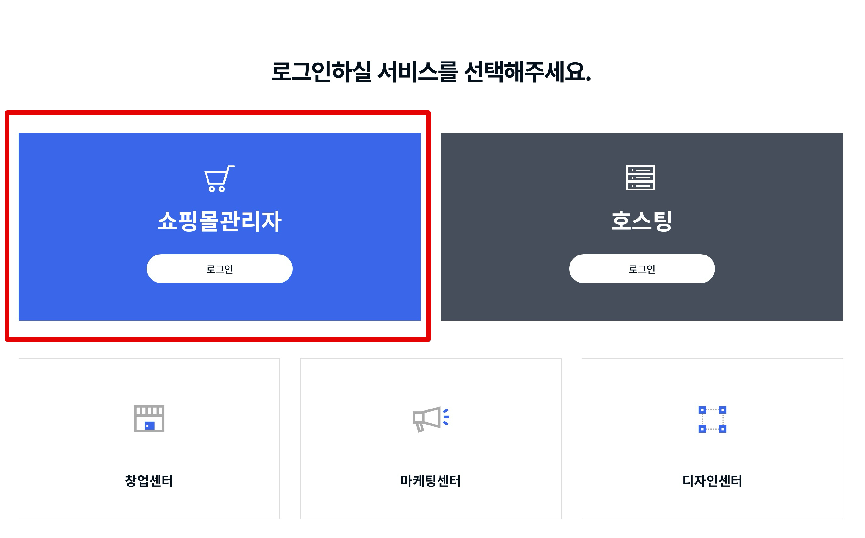 카페24 홈페이지 접속 후 회원가입을 진행해줍니다. 이때 쇼핑몰 관리자로 로그인하는게 있고 호스팅으로 가입하는게 있는데 우리는 지금 쇼핑몰을 오픈하려고 하는 것이기 때문에 쇼핑몰 관리자로 로그인해야합니다.