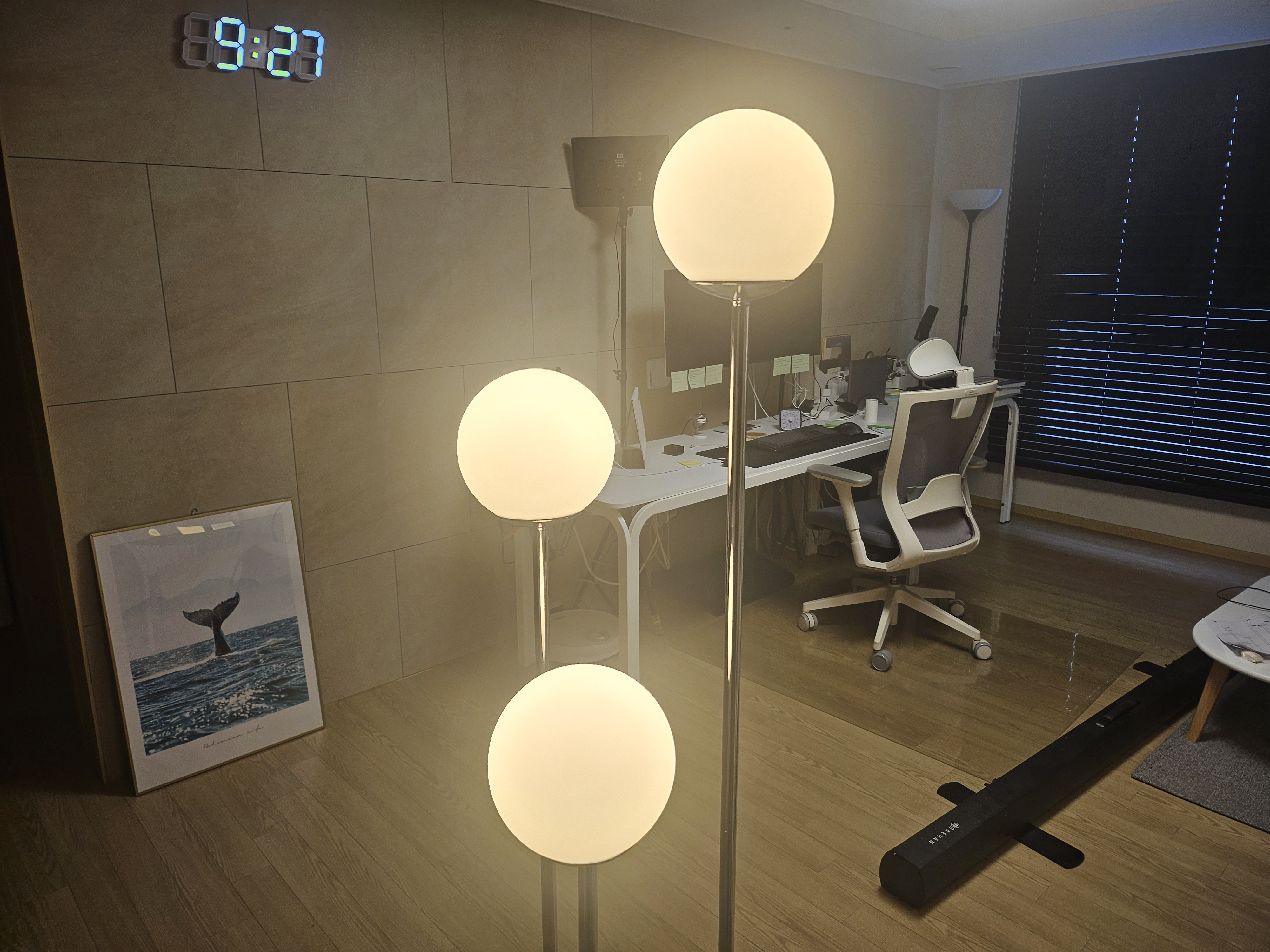심리스함 스탠드 조명은 전구쪽은 진짜 예쁜데... 아래쪽에서부터 올라오는 구간이 조금 복잡해보이는 느낌?이 있어서 하단 부분을 조금 가려주는 인테리어를 하면 좋은 것 같아요. 그러면 윗부분만 보이면서 디자인이 확~ 살아납니다 ㅋㅋ