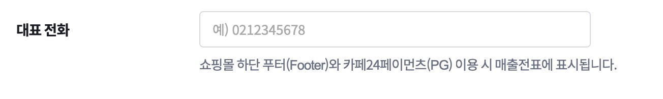 그리고 다음으로 대표전화를 넣는 부분이 있는데요. 이 부분은 쇼핑몰의 푸터(쇼핑몰 제일 하단 부분)에 전화번호가 공개되는 곳이며 매출전표에서 표시되기 때문에 전화번호를 잘 적어주셔야하는데 개인으로 쓰는 스마트폰 번호를 적는건 추천되지 않습니다.