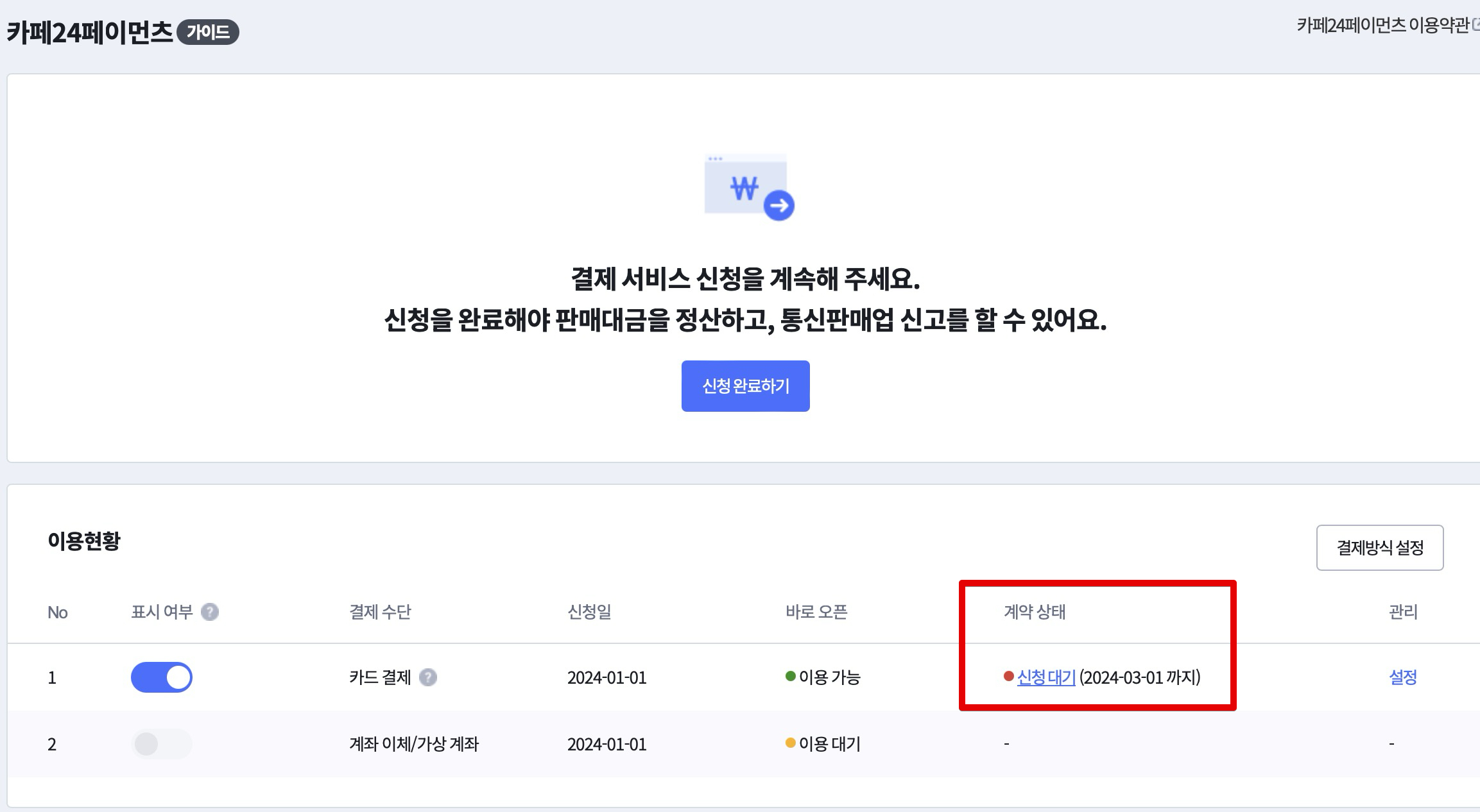 현재 카페24 페이먼츠 이용현황을 확인해보면 해당 카드결제가 신청대기로 돼 있는걸 볼 수 있습니다. 이 부분을 신청 및 심사를 받아서 통과해야합니다. 위 화면을 볼 수 있는 메뉴 순서는 [카페24 관리자(첫화면)] - [부가서비스] - [카페24페이먼츠(PG)] - [이용현황]입니다.