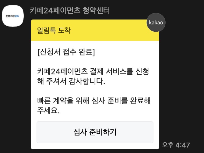 여기까지 오게되면 카페24페이먼츠 청약센터라는 곳에서 카카오톡 알림톡으로 신청서 접수가 완료되었다고 알려줍니다.