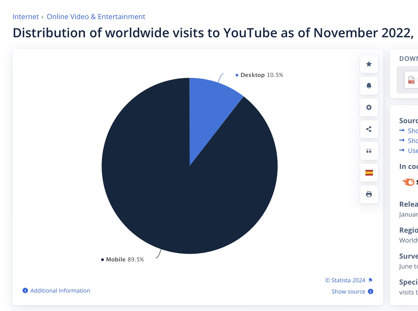 실제로 2022년 데이터를 살펴보면, 유튜브에 방문하는 사용자들 중 89%가 모바일로 방문하며 데스크탑 환경은 10% 정도밖에 안됩니다.