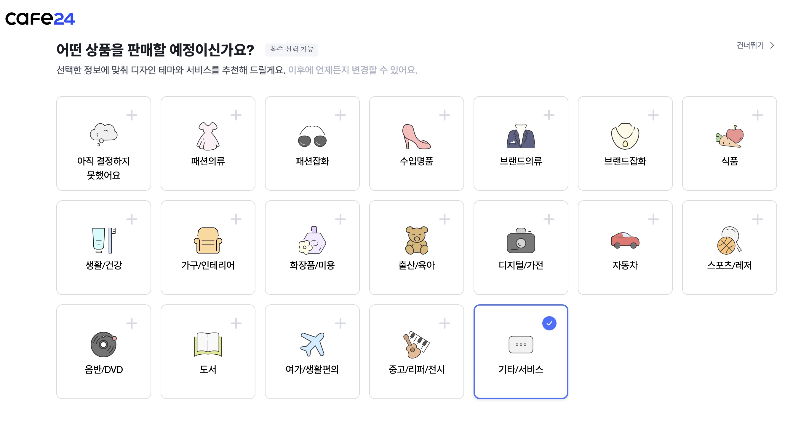 제일 먼저 어떤 상품을 판매할 것인지를 물어보는 메뉴가 있습니다. 여기에서 실제로 판매할 제품을 고르면 다음 메뉴에서 이어지는 디자인을 좀 더 적절한 것으로 고를 수 있습니다. 하지만 큰 차이는 없습니다.