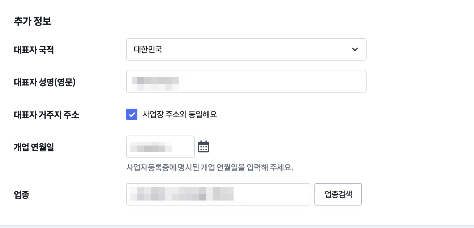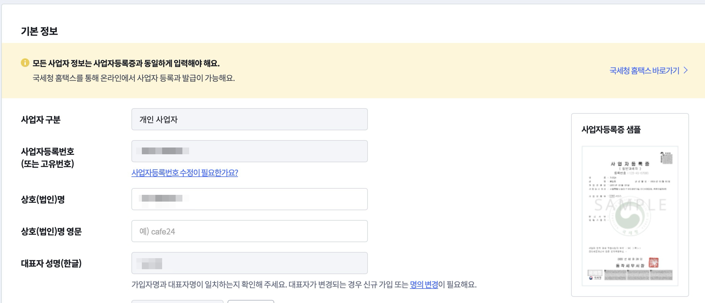 이어서 기본정보 입력해줄게요. 사업자등록번호 및 상호명 등 순서대로 계속 입력해줍니다.