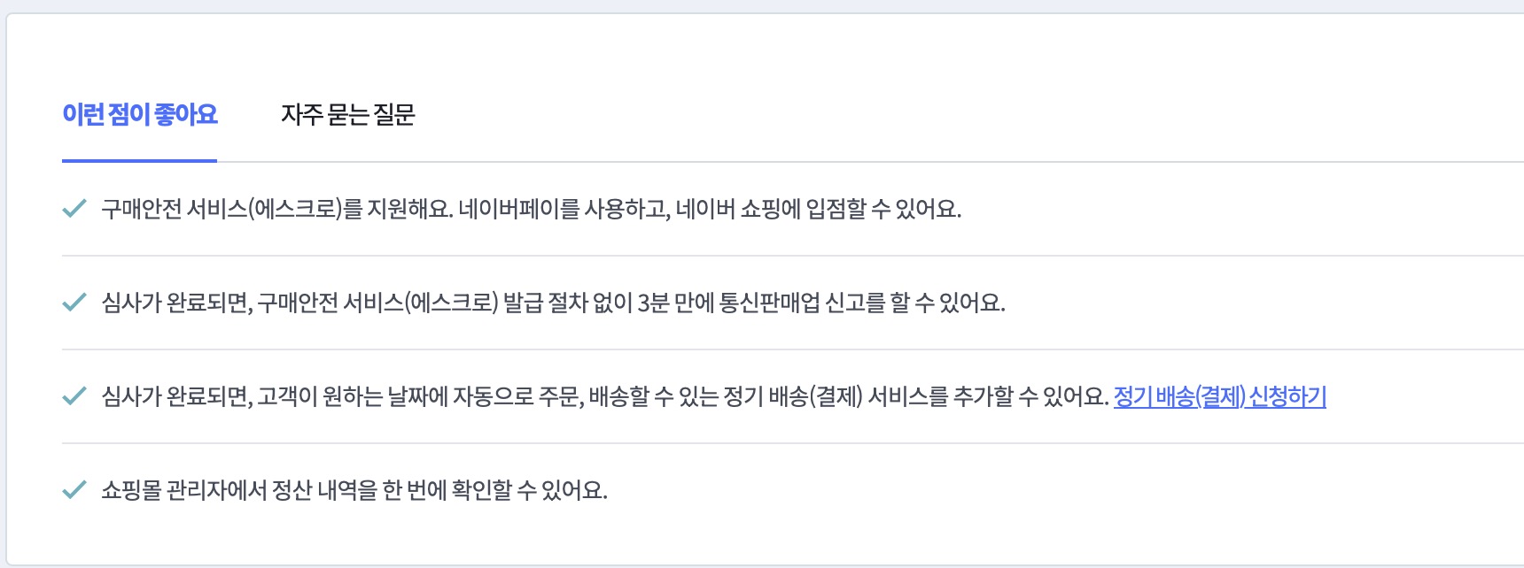 - 카페24페이먼츠를 통해 신청하면 구매안전서비스(에스크로)를 지원한다. 에스크로가 있어야 추후 네이버페이를 사용하고 네이버 쇼핑에 입점할 수 있다.