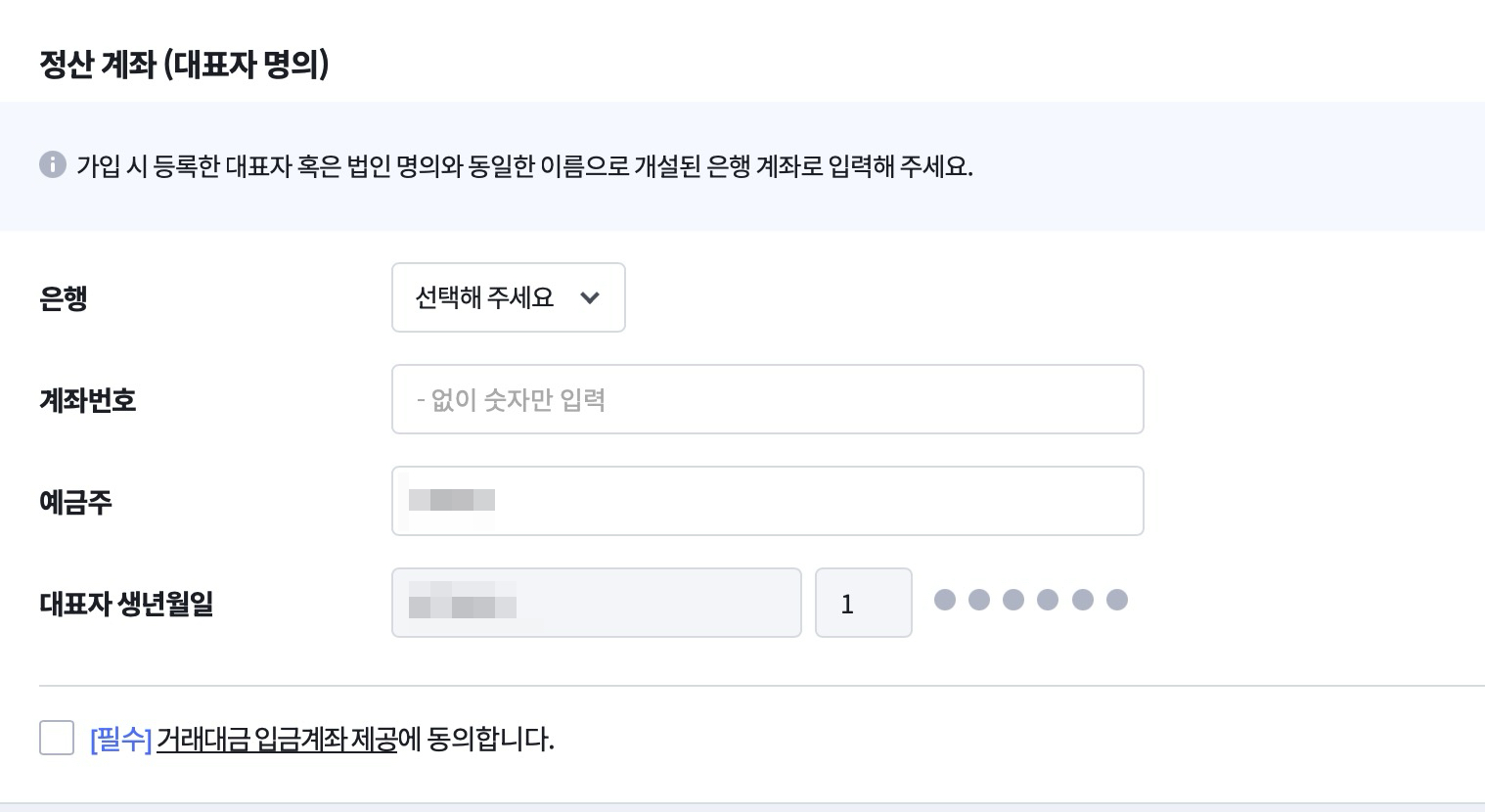 정산 계좌를 넣어주는데 사업자통장 있으시면 사업자통장을 적어주면 좋겠죠? 이때에는 예금주에 이름(사업자)를 정확하게 기입해줍니다.