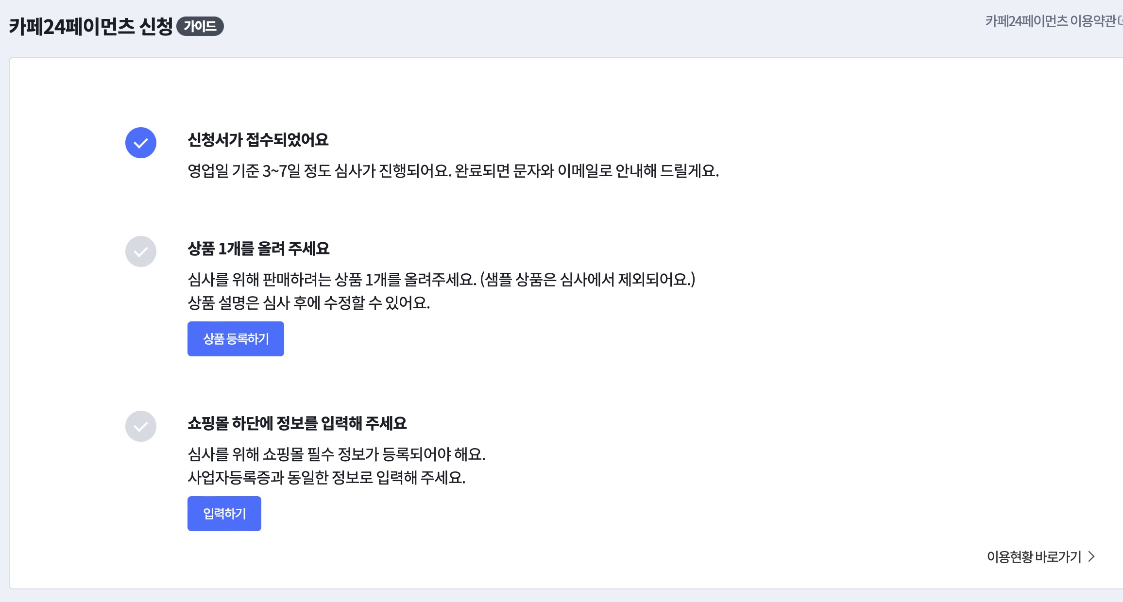 여기까지 오게되면 카페24페이먼츠 신청이 접수가 되었습니다. 이후 상품 1개를 업로드해야하며 쇼핑몰하단에 정보를 입력해주어야 신청이 완료가 됩니다. 이 부분은 다음 글에서 다룹니다.