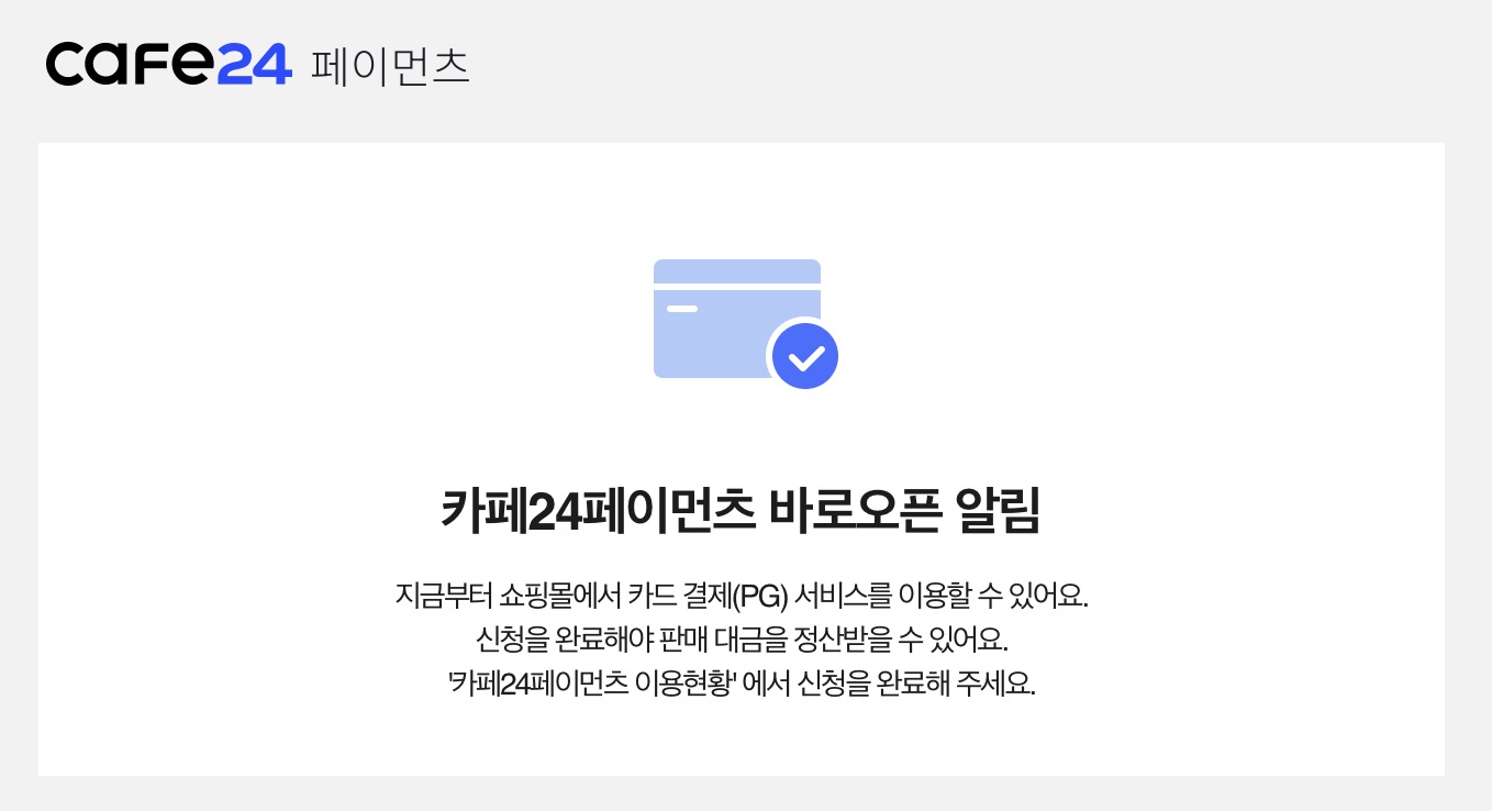 카페24페이먼츠는 쇼핑몰에서 카드결제(PG)서비스를 해주는 시스템입니다. 신청을 완료해야 판매 대금을 정산받을 수 있으므로 미리 신청해야합니다.
