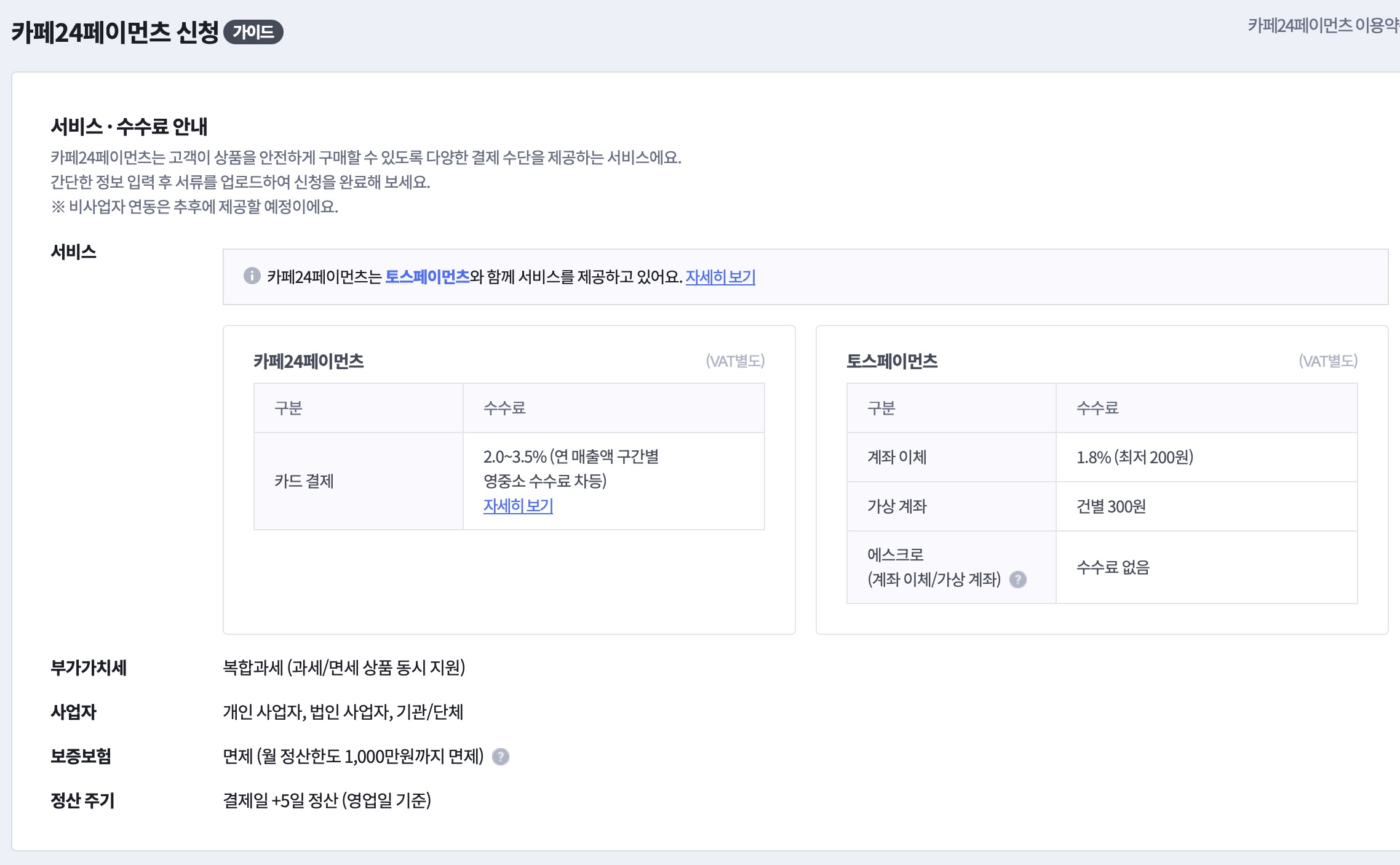토스페이먼츠의 경우 계좌이체는 1.8% 수수료를, 가상계좌는 건별 300원이며 에스크로에는 수수료가 없습니다. 카페24페이먼츠의 결제는 부가세의 경우 복합과세 적용하며 개인사업자 및 법인, 기관과 단체도 이용할 수 있습니다. 기본적으로 보증보험은 면제이며 월 정산한도 1000만원까지입니다. 정산주기는 결제일+5일(영업일 기준)입니다.
