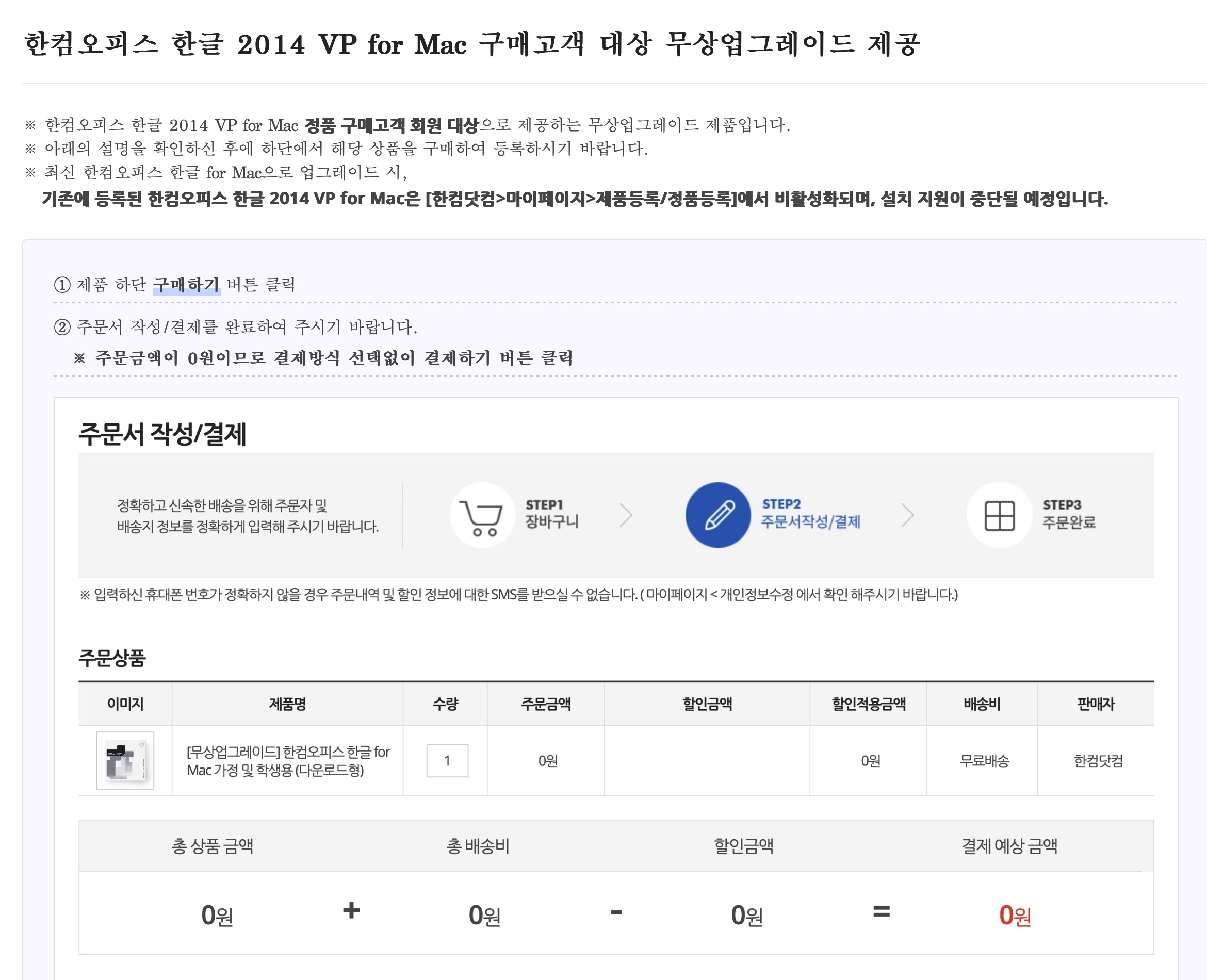 무상 업그레이드 대상자분들은 0원으로 구매결제하는 방식으로해서 새롭게 사용을 할 수가 있는데요. 저같은 경우 확인해보니까 한글 2014 VP for MAC이 아니라