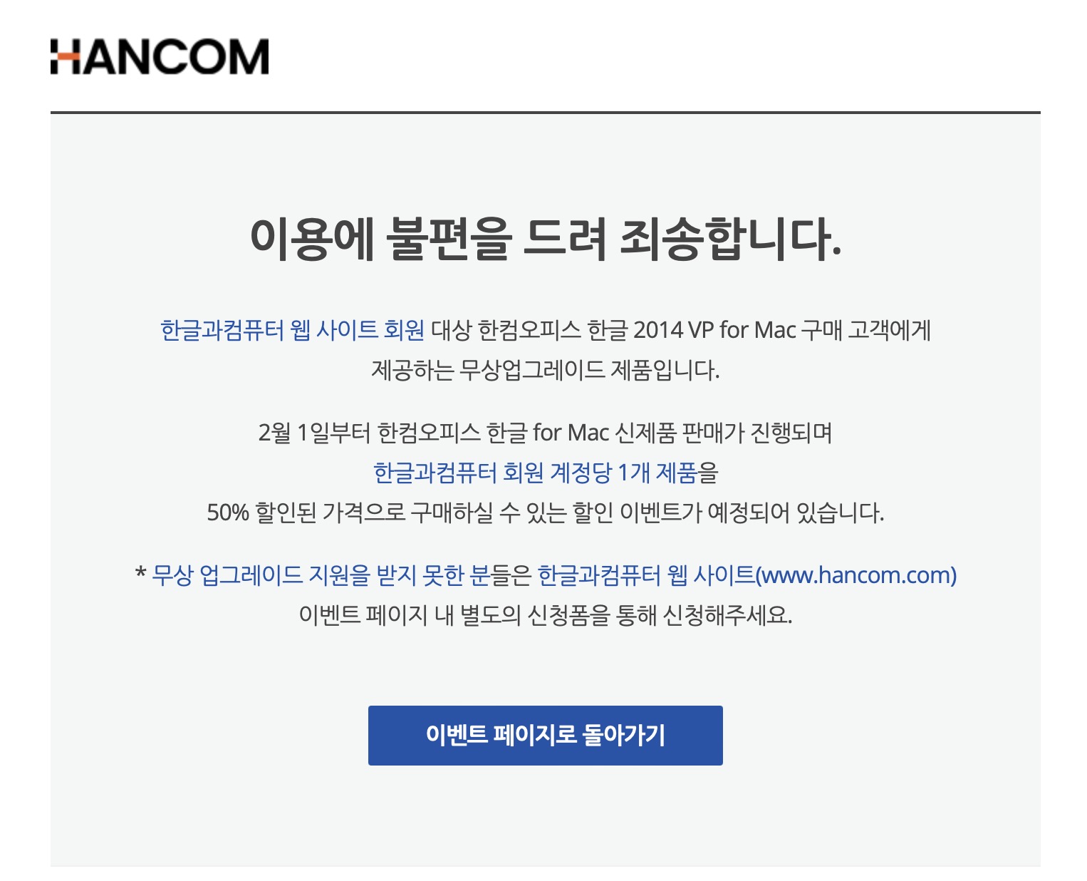이러한 영향에 의해서인지 이번에 한컴에서 맥용 한글 2014를 구매했던분들을 대상으로 무상업그레이드 진행 + 한정된 기간동안 한글 for MAC의 50% 할인을 제공한다는 소식이 떴었고, 그게 오늘이었습니다. 그래서 저도 오늘 업그레이드하려고 시도해보았는데요.