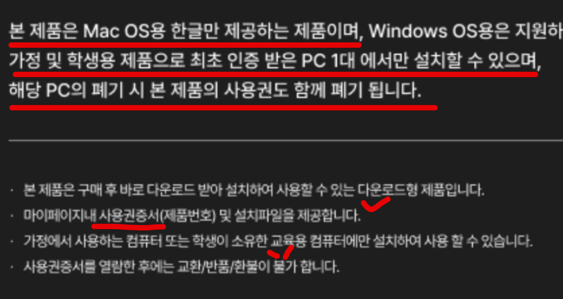 이번에 나오는 맥용 한글의 경우 1PC Only 제품이라서 최초 인증받은 PC 1대에만 설치가 가능하며, 해당 PC가 폐기될 경우 사용권도 함께 폐기된다는 내용이에요. 눈을 의심하게 만드는 내용인데, 이 부분은 한컴에다가 문의글을 넣어서 좀 더 자세히 물어볼 예정입니다.