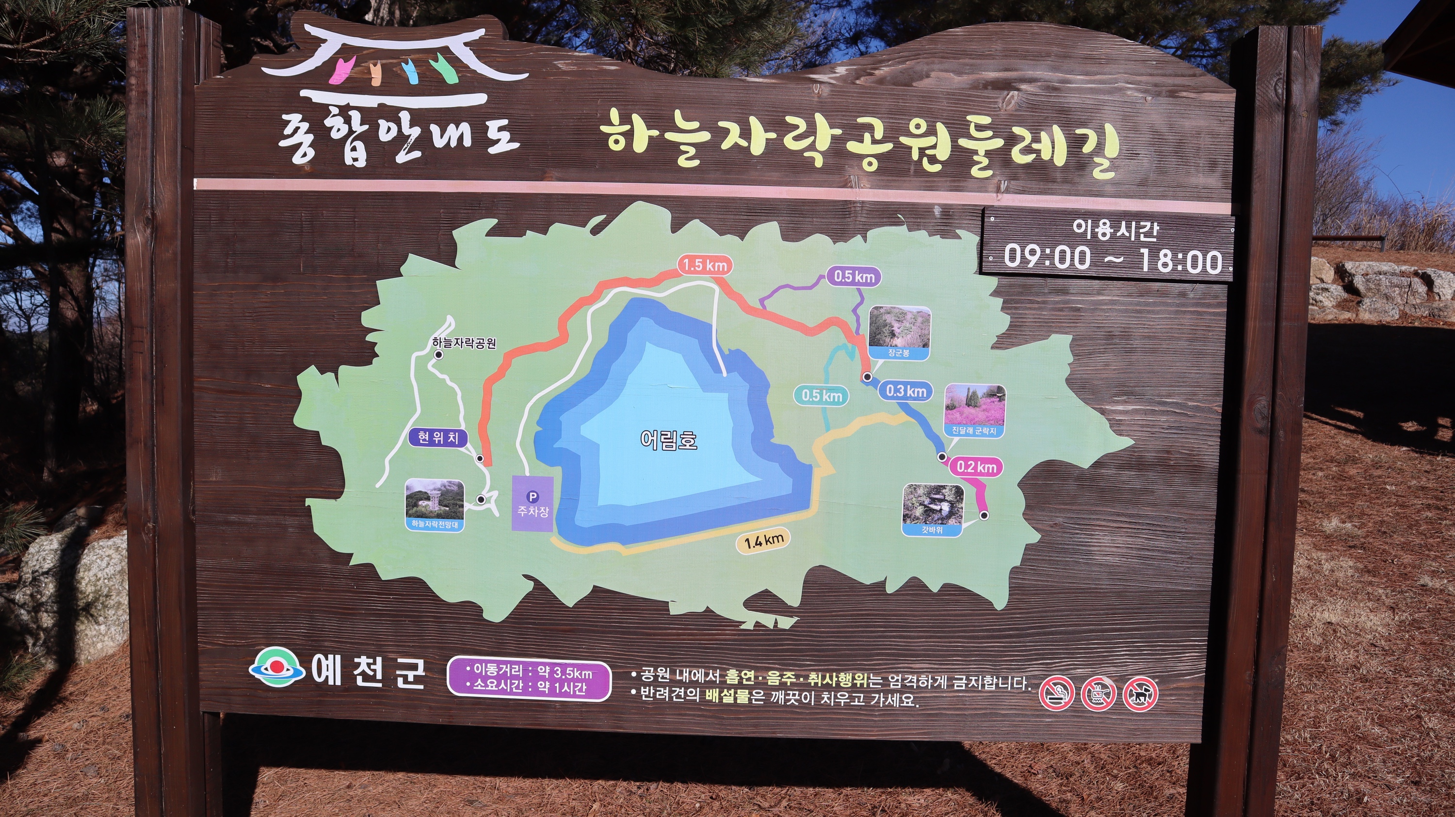 소백산하늘자락공원 입구에 드디어 도착했습니다. 현 위치를 주변으로 어림호를 둘러싼 하늘자락공원둘레길도 있으니 참고하세요. 약 3.5km 정도되며 1시간 코스입니다. 안내판 옆에 있는 정자에서 쉬어가도 좋겠죠?