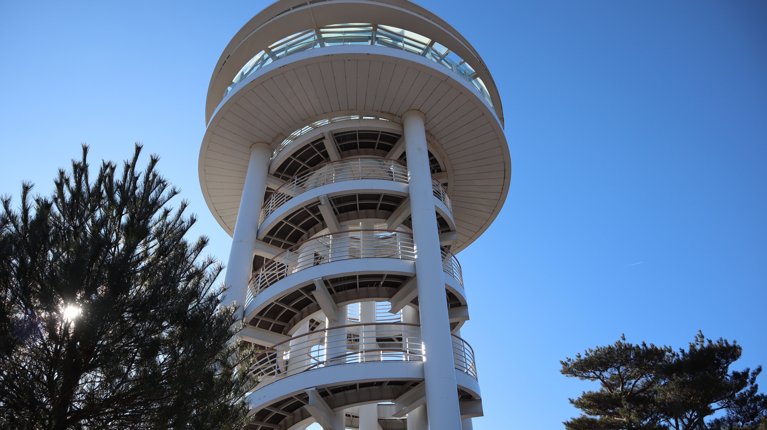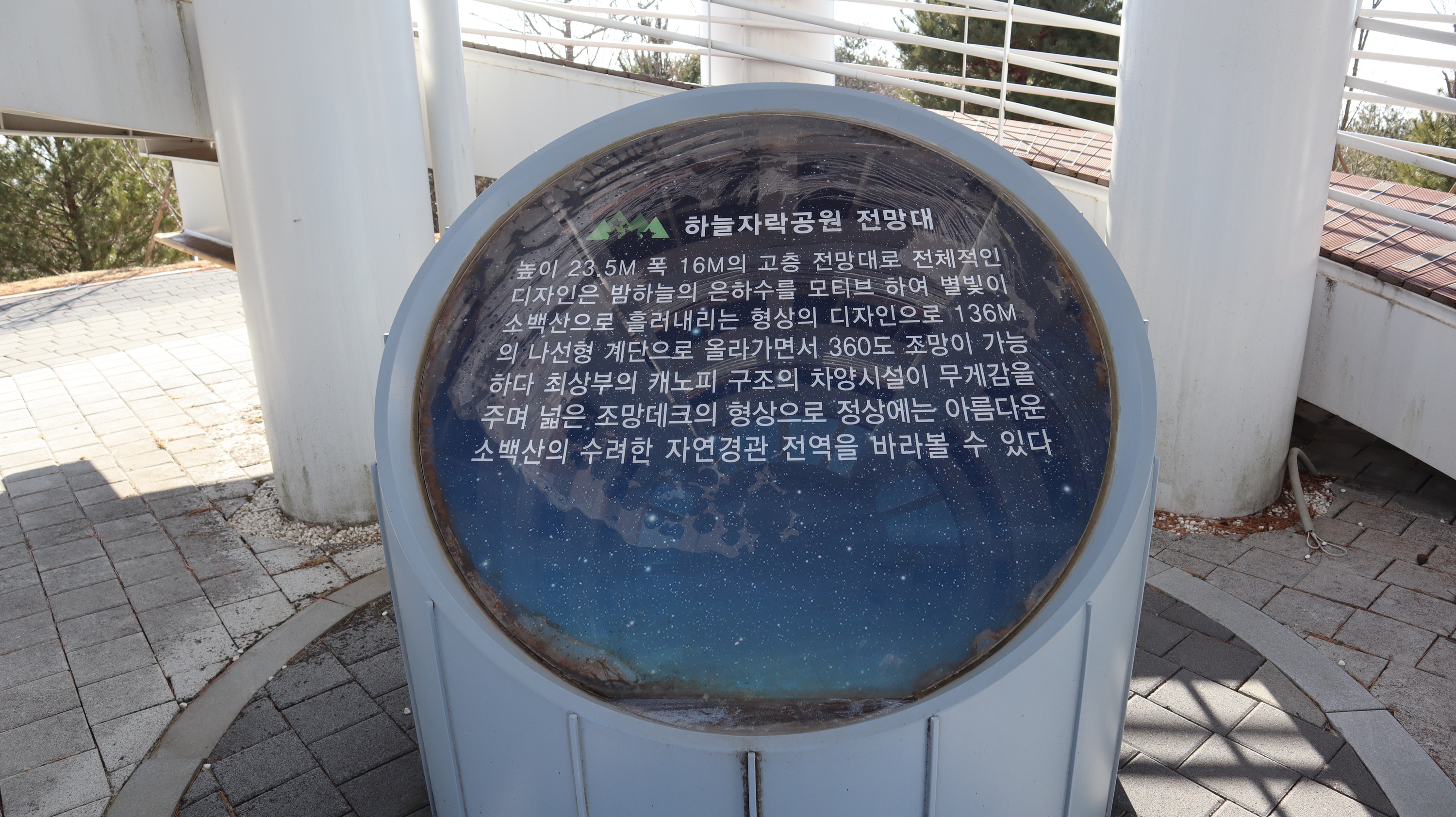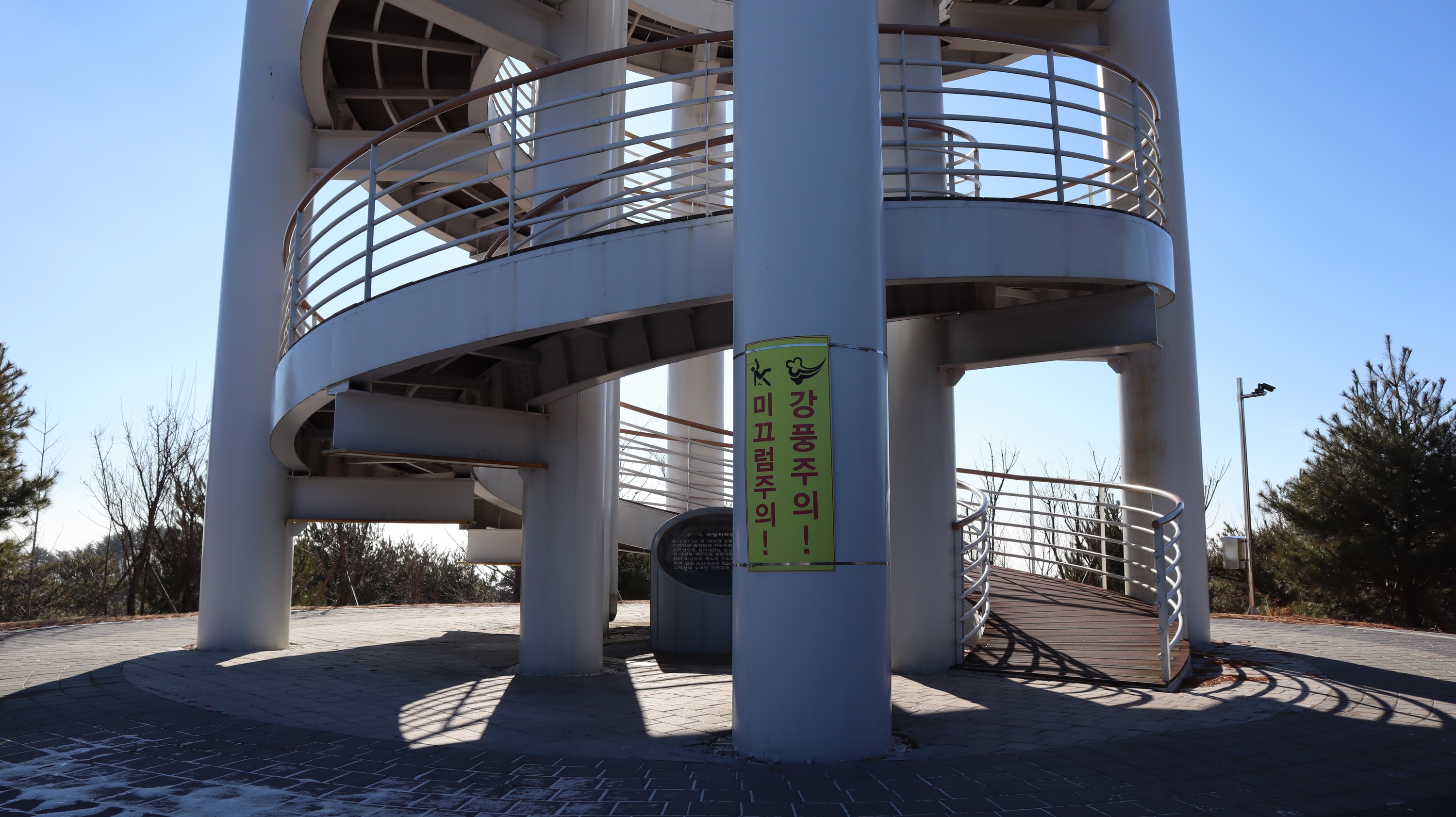 전망대의 이름은 하늘자락공원 전망대입니다. 높이 23.5M, 폭 1.6M의 고층 전망대로서 밤하늘의 은하수를 모티브로해서 별빛이 소백산으로 흘러내리는 형상으로 디자인 되었다고 합니다. 나선형으로 된 계단을 올라가면 전망대 정상부에 도착할 수 있습니다.