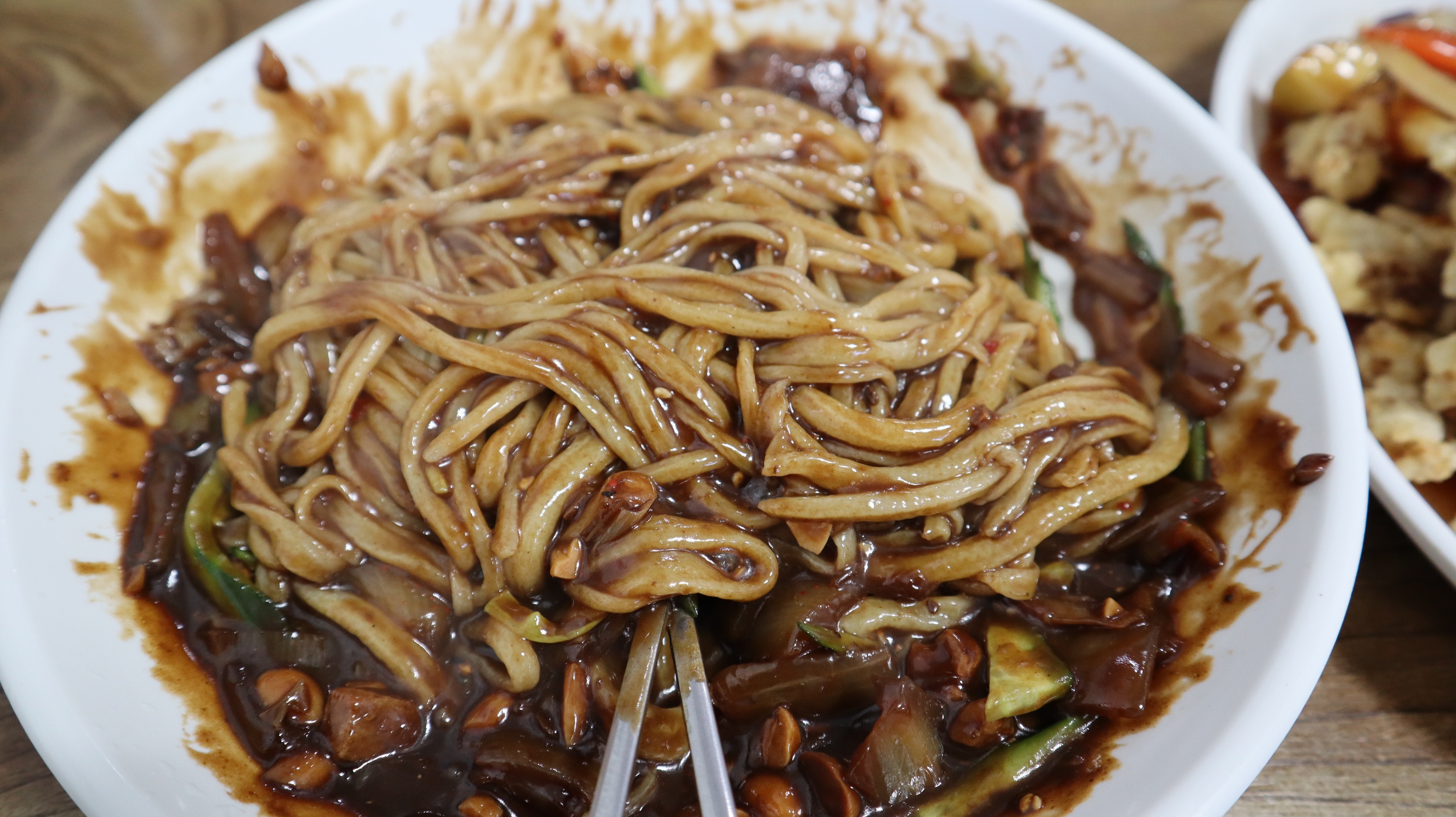 짜장면에서 면이 수타면이네요. 이 곳 가게의 장점인 것 같아요. 저는 개인적으로는 수타면이나 기계면이나 크게 신경쓰지 않는 타입인데 간만에 먹어보는 수타면 짜장면은 확실히 매력이 있었고요. 주방쪽에서는 사장님께서 수타면을 만드는 모습도 얼핏 감상이 가능합니다. ㅎㅎ