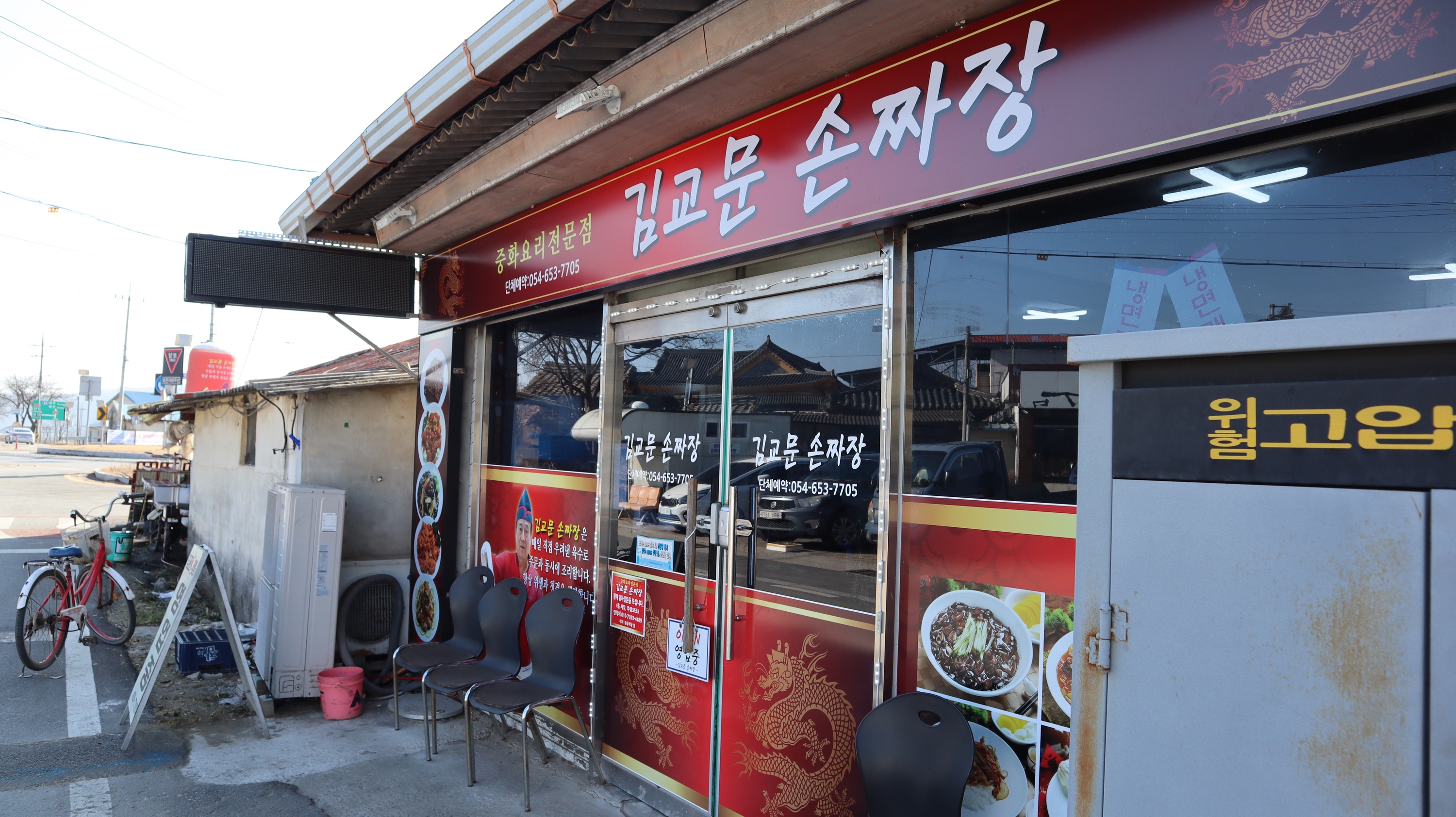 예천에서 성업 중인 김교문손짜장이라는 곳이에요. 접근성이 좋은 곳에 자리잡고 있는데 저는 1인으로 혼밥하러 갔었는데도 친절하게 안내해주시고 맛있는 식사도 서비스해주셨던 가게입니다. 가게의 정확한 이름은 김교문손짜장인데 입간판에는 김교문맛짬뽕이라고 돼 있는데, 아마 예전 이름이 아니겠나... 생각이 듭니다.