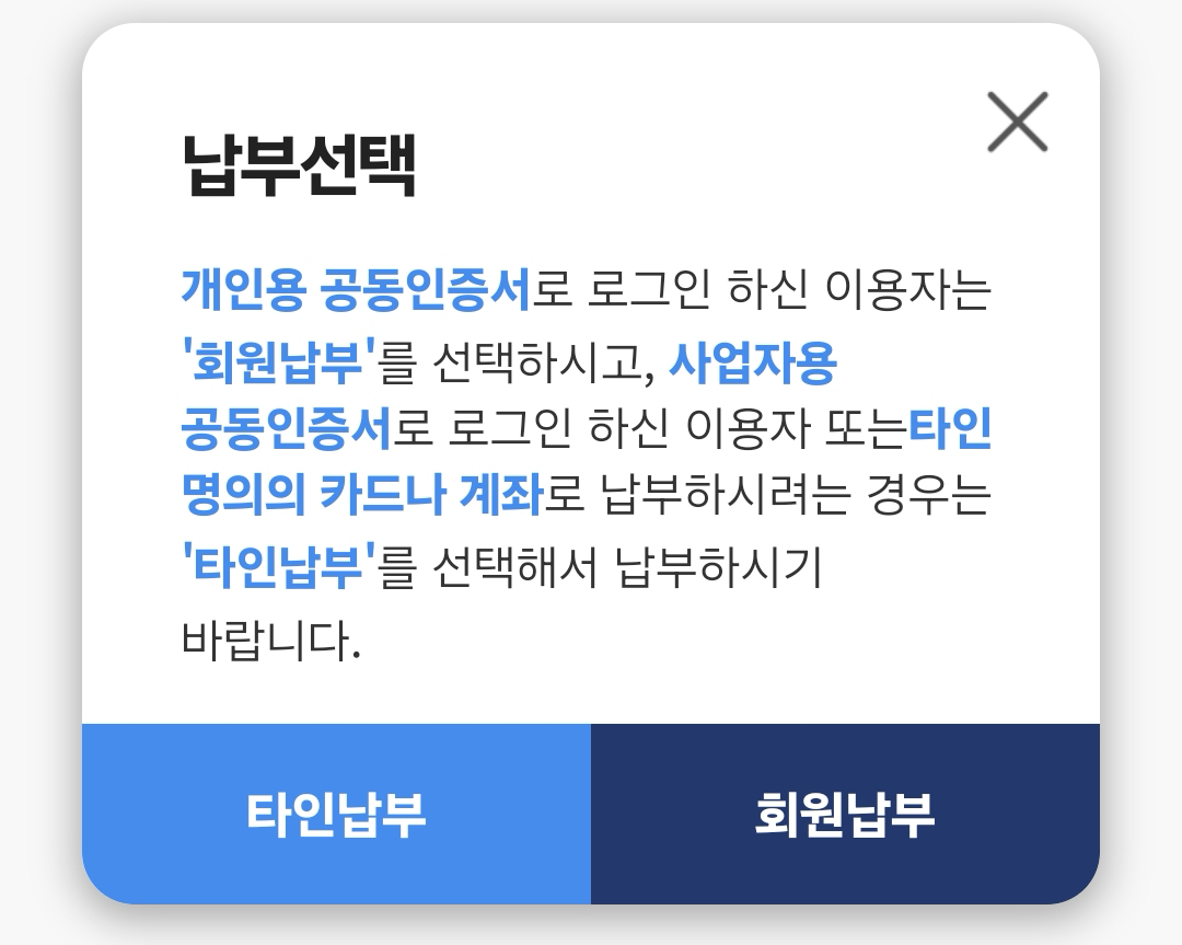 다음으로 납부선택하면 되는데 타인일 경우 타인납부로, 본인일 경우 회원납부 선택해주고요.