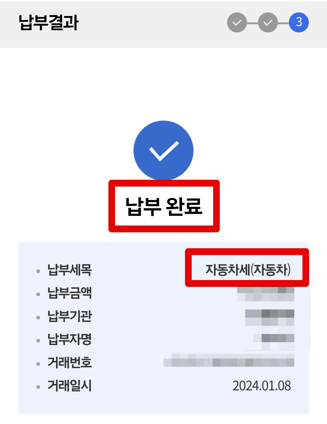 납부 결과 보시면 됩니다. 자동차세 납부 지로용지의 경우, 제 경험상 1월 중순 이후로 도착하는 케이스가 많아서 일자가 촉박할 수 있어요. 스마트 위택스 앱에서는 전산에 등록되기만 하면 바로 조회가 가능하며 보통 1월 10일 이전에 조회가 가능해서 지로 용지 도착 이전부터 바로 납부할 수 있습니다. 어차피 낼 세금이라면 생각났을 때 미리미리 납부해서 가산세 안받는게 유리할 것입니다.