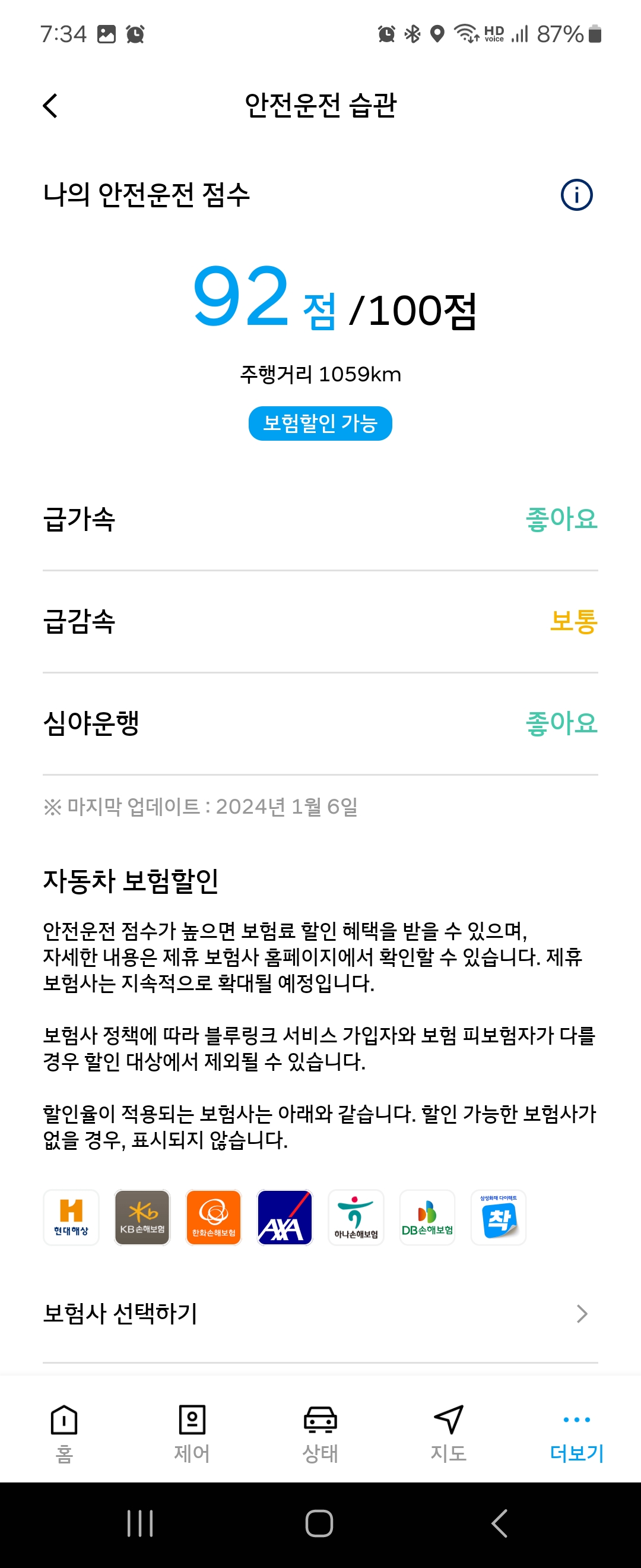 블루링크 앱에서 점수 확인 가능한데요. [더보기] - [안전운전습관]메뉴로 들어가면 점수 나옵니다. 저는 92점이 나왔네요. 키로수 1059km에 스크린샷 찍었지만, 실제로 가입되는 과정에서 주말도 껴있고 하다보니까 5일이 소요되어 키로수는 더 증가했습니다. 점수는 그대로 92점입니다.