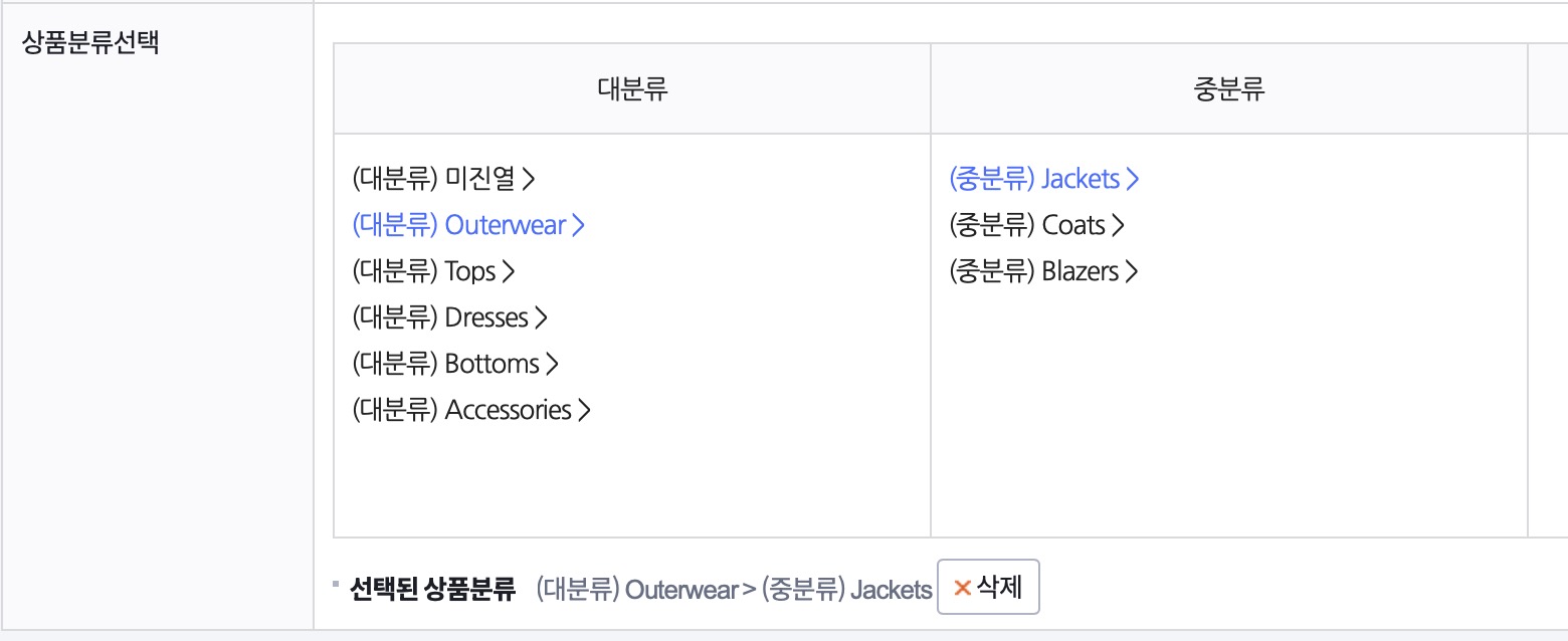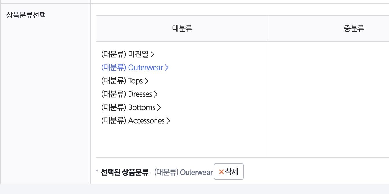 이제 상품 등록 과정에서 상품 분류를 정해야하는데, 이 부분은 나중에 PG계약심사가 끝난 뒤에 따로 정리를 해줄 것이므로 지금은 정리하지 않고 기본으로 나와있는 카테고리 중에서 [미진열]이라고 된 카테고리는 제외하고 다른 카테고리에 상품을 등록해주세요. 그래야 쇼핑몰 화면 첫화면에 상품이 표시됩니다.