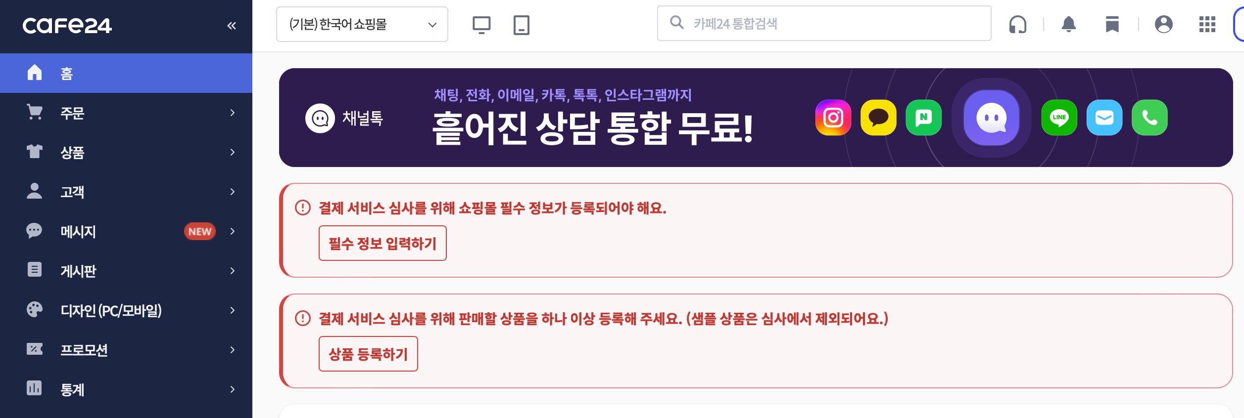 카페24 쇼핑몰 관리자 첫 화면에 보면 결제 서비스 심사를 위해서 쇼핑몰 필수 정보가 등록되어야한다고 돼 있고 아래쪽에 상품을 하나 이상 등록하라고 안내해줍니다. 순서대로 하기 위해서 쇼핑몰 필수 정보부터 등록합니다.