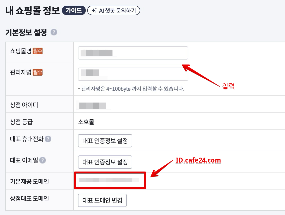 제일 먼저 쇼핑몰명과 관리자명을 넣고요. 아래쪽에 기본제공 도메인도 체크하세요. 카페24 쇼핑몰은 ID.cafe24.com 으로 주소가 만들어집니다.