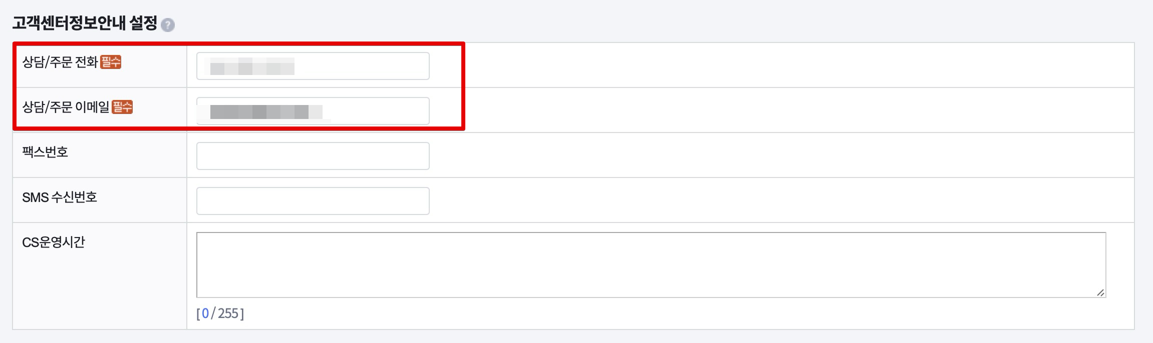 그리고 필수 항목 중에서 상담/주문 전화에 필요한 전화번호와 상담 및 주문용 이메일 주소 넣어주세요. 여기까지 하게되면 필수 쇼핑몰 정보 입력은 끝나게됩니다.