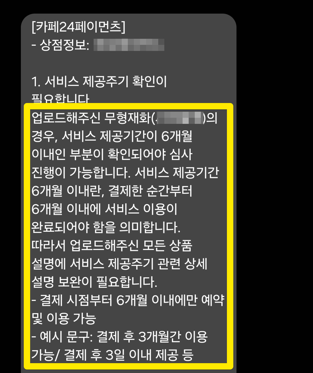 이러한 문자메시지를 받게 되었는데, 요지는 무형재화의 경우 서비스 제공기간이 6개월 이내인 부분이 확인이 되어야 심사 진행이 가능하다고 하며, 해당 내용을 상품 본문 페이지에 명시를 해야한다는 것이었습니다.