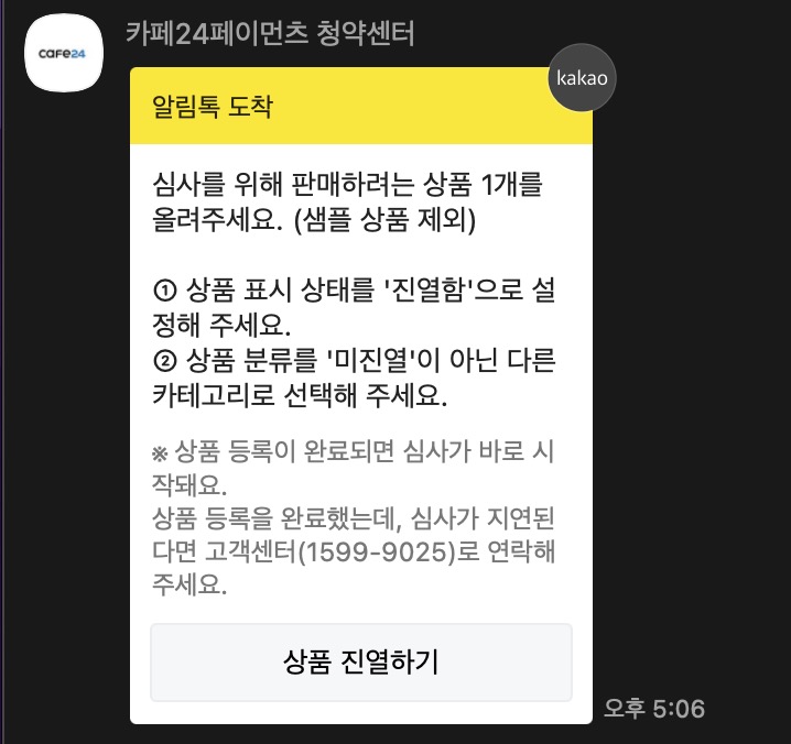 카페24 페이먼츠 청약센터 카카오톡 알림톡에서는 이러한 알림톡을 보내주는데요. 상품을 등록한 후 영업일 기준으로 3일~5일 정도가 소요되기 때문에 빠르게 오픈해야하는분들의 경우에는 최대한 빨리 상품을 등록하는게 좋습니다.