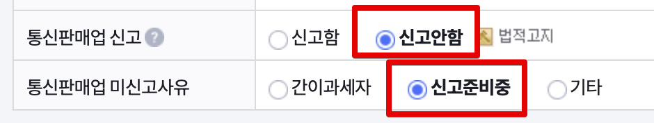다음으로 통신판매업 신고창이 있는데 현재는 통신판매업 신고가 돼 있지 않으므로 [신고안함]으로 체크하시고요. 통신판매업 미신고사유에는 [신고준비중]에 체크하세요. 그리고 나중에 PG계약심사가 통과되면 그 이후에 통신판매업을 신고할 예정입니다.