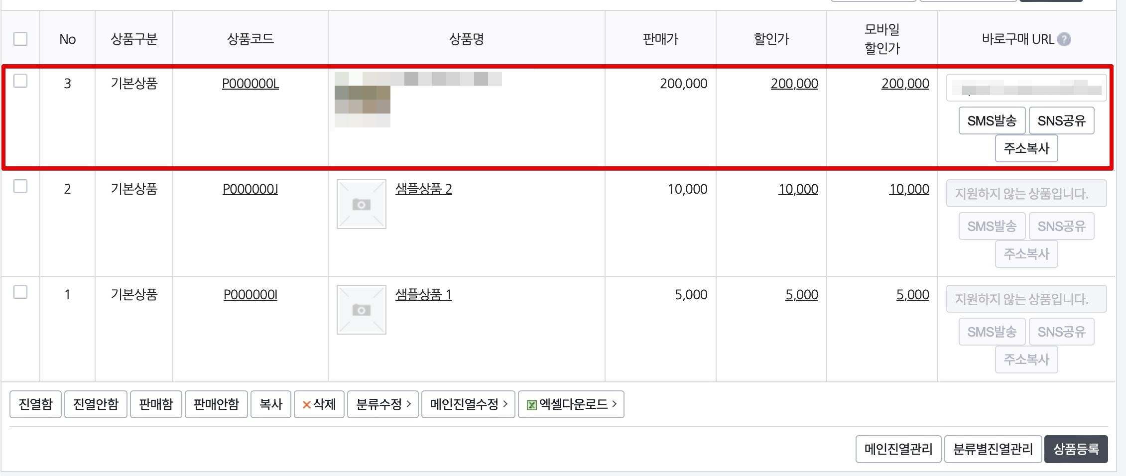 새롭게 등록한 상품이 잘 등록되어 있는지 보시면 됩니다. 아래쪽에 샘플 상품은 이제 지워도 무방하며, 어차피 샘플 상품은 심사 대상도 아닙니다.