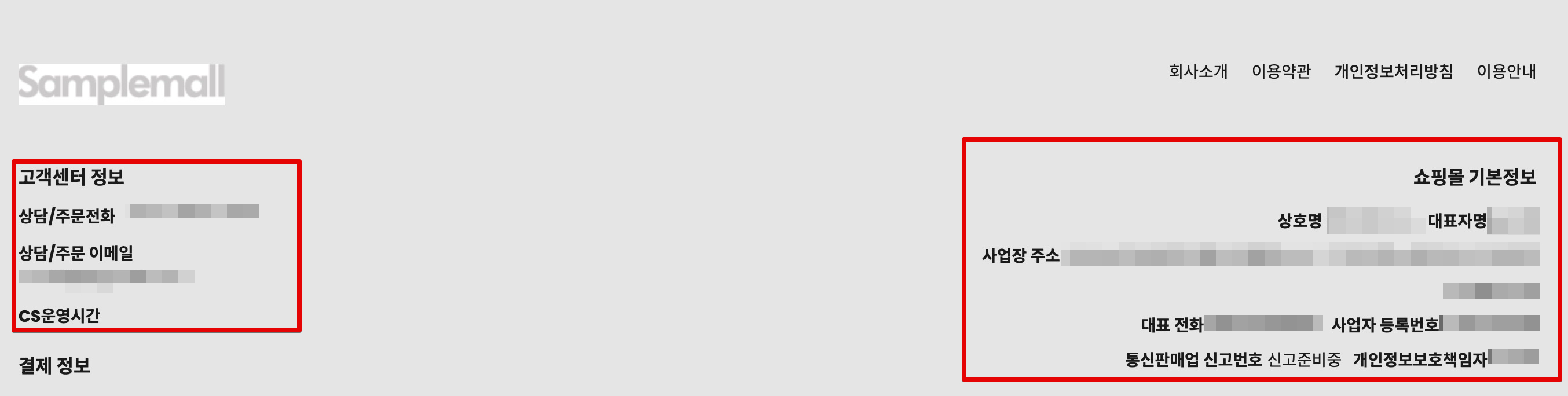 이제 쇼핑몰로 들어가서 하단쪽으로 내려보면 푸터 부분에 내가 입력했던 정보와 쇼핑몰 기본 정보를 볼 수 있게 되고요.
