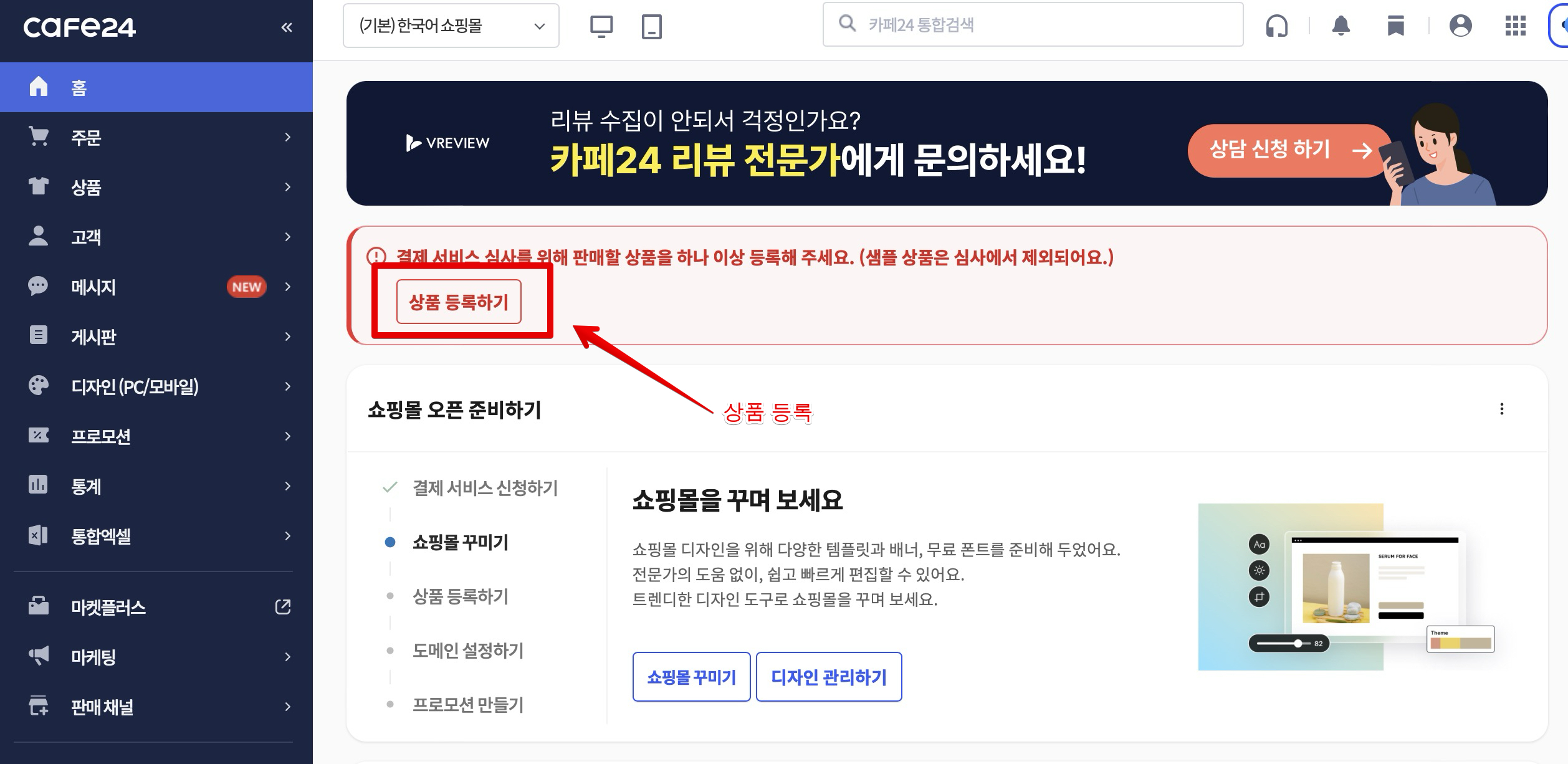 지난번 글까지해서 카페24 쇼핑몰을 생성하고 카페24페이먼츠를 설정하였습니다. 이제는 PG계약 심사를 위해서 상품 등록과 쇼핑몰 하단 정보인 푸터 입력을 해야합니다.