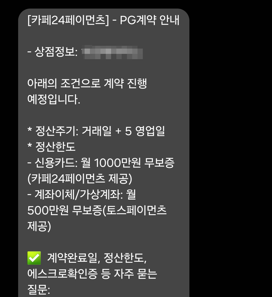 이후 재심사 통과하여 PG계약 심사가 완료되었습니다. 정확하게는 카페24페이먼츠(PG) 심사가 완료되었습니다. 이제 해당 내용을 바탕으로 온라인 사업자의 의무사항인 통신판매업 신고를 진행할 수 있으며 에스크로도 이용이 가능합니다. 통신판매업과 에스크로 이용은 다음번 글에서 이어서 따라와주세요!